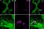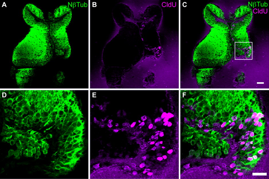 Figure 7. Injury increases the generation of new neurons. The right tectal lobe of stage 47 tadpoles was injured. Two days later tadpoles were then exposed to CldU for 2 hours in rearing solution and were allowed to develop in the absence of CldU for 2 days. AâF: Representative images of single optical sections of N-β-tubulin (green; A,C,D,F) and CldU (magenta; B,C,E,F)-immunoreactivity in 30-μm vibratome sections. DâF: Enlargements of boxed area in C. Scale bars = 50 μm in C; 20 μm in F.