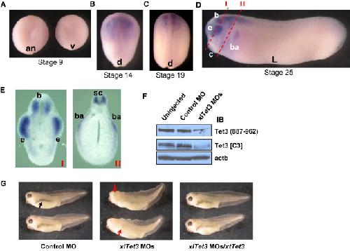 Figure 1. Tet3 Is Important for Early Eye and Neural Development. (AâE) Spatial expression profile of xlTet3 by in situ hybridization at stage 9 (A), 14 (B), 19 (C), and 25 (D and E). The sites of sections I and II in (E) are noted by red dashed lines in (D). Animal view (an), vegetal view (v), dorsal view (d), lateral view (L), brain (b), eye (e), cement gland (c), branchial arches (ba), and spinal cord (sc).(F) Western blot showing depletion of endogenous Tet3 protein by xlTet3 MOs in stage 14 embryos.(G) Developmental defects in stage 35 embryos caused by Tet3 depletion. Small head, eyeless, and missing pigmentation phenotypes in xlTet3 MOs-injected embryos are noted by red arrows, and the normal pigmentation in control embryos is noted by a black arrow.See also Figure S1.