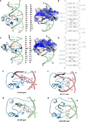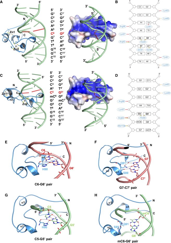 Figure 5. The Tet3 CXXC Domain Specifically Recognizes Cytosine through a Conserved Residue His90. (A and C) Crystal structures of the Tet3 CXXC domain in complex with ACGT DNA (5â²-GCCAACGTTGGC-3â²) (A) or CmCGG DNA (5â²-GCCACmCGGTGGC-3â²) (C) in cartoon (left) and electrostatic representations (right), respectively. The double-stranded DNA sequence is shown in the middle of each corresponding panel.(B and D) Detailed interactions between the Tet3 CXXC domain and ACGT DNA (B) or between the Tet3 CXXC domain and CmCGG DNA (D). Red arrow, salt bridge interaction; olive arrow, hydrogen bond interaction; yellow arrow, electrostatic interaction.(E and F) Detailed interactions between the Tet3 CXXC domain (blue cartoon) and the target CG pair (E) or the following GC pair (F) in the ACGT DNA (red cartoon).(G and H) Detailed interactions between the Tet3 CXXC domain (blue cartoon) and the target CG pair (G) or the following mCG pairs (H) in the CmCGG DNA (green cartoon).See also Figures S5 and S6.