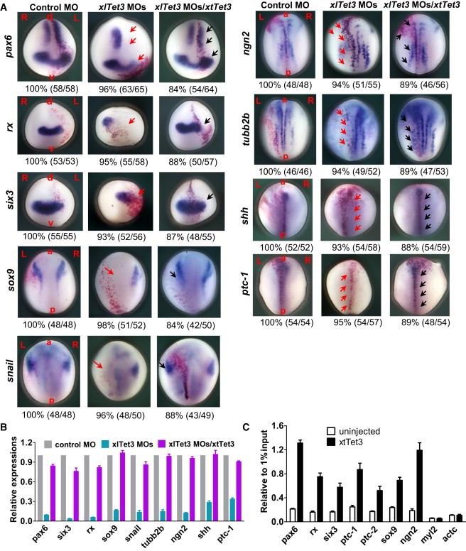 Figure 2. Tet3 Directly Regulates Key Developmental Genes. (A) Expression level changes of developmental genes resulting from Tet3 depletion as shown by in situ hybridization at stage 14. Red arrows show the inhibited expression by xlTet3 MOs injection, whereas black arrows show rescued expression by xtTet3 coinjection. L, left; R, right; a, anterior; p, posterior; d, dorsal; v, ventral. The red dots are injection tracer by β-gal staining.(B) RT-qPCR confirms the differentially expressed genes after Tet3 depletion at stage 14. Control MO, xlTet3 MOs or xlTet3 MOs/xtTet3 was injected into two dorsal blastomeres at 4-cell stage. Relative gene expression was normalized to odc. Results are shown as mean ± SD (n = 3).(C) Tet3 occupancy at target gene promoters by ChIP-qPCR assay. Data are presented as mean ± SEM (n = 3).See also Figure S2.