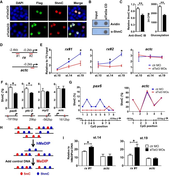 Figure 3. Tet3 Is an Active 5mC Hydroxylase Regulating the 5mC/5hmC Status at Target Gene Promoters. (A) xlTet3 CD is sufficient to convert 5mC to 5hmC in HEK293T cells by immunofluorescence analysis. Flag-tagged xlTet3 CD protein was detected using Flag antibody.(B) xlTet3a CD protein converts 5mC to 5hmC in vitro by dot-blot assay. Avidin-HRP is used to detect total biotin-labeled DNA, showing equal loading.(C) Tet3 depletion results in globally decreased 5hmC in stage 14 embryos by dot-blot (left) and 5hmC glucosylation (right) assays. Open bar, control MO; filled bar, xlTet3 MOs. Data are presented as mean ± SD (n = 3). ââp < 0.01.(D and E) hMeDIP-qPCR to detect dynamic 5hmC level changes in stage 10, 14, and 19 embryos. The targeting region for each primer set is underlined in (D). Results are shown as mean ± SD (n = 3) in (E). âp < 0.05.(F) Site-specific 5hmC level changes by Tet3 depletion in stage 14 embryos using the EpiMark 5mC/5hmC analysis kit. Open bar, control MO; filled bar, xlTet3 MOs. Red dot indicates MspI/HapII recognition site and each PCR amplified region is underlined. Arrow denotes promoter orientation. Data are shown as mean ± SD (n = 3). âp < 0.05.(G) TAB-seq analyses of 5hmC status at the promoter of pax6 (left) and actc (right) in stage 14 embryos. The average percent at each CpG site is derived from sequencing of 30â32 clones for pax6 promoter and 24â26 clones for actc promoter.(H) Schematic diagram of hMeDIP-MeDIP strategy.(I) hMeDIP-MeDIP qPCR to detect 5mC level changes after Tet3 depletion in stage 14 and 19 embryos. Data are shown as mean ± SD (n = 3). âp < 0.05. The targeting region for each primer set is shown in (D).See also Figure S3.