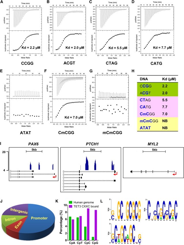 Figure 4. The Unique DNA Binding Properties of the Tet3 CXXC Domain. (AâH) Binding affinities of the Tet3 CXXC domain to various DNA oligos by ITC assays. The sequence of the central four nucleotides of each double-stranded DNA probe is shown under the corresponding panel. Detailed sequence information for all DNA oligos used in this study is listed in Table S1. NB: no binding.(I) Representative TET3 CXXC GST pull-down sequencing results. Arrow denotes promoter orientation.(J) Genomic distribution of the TET3 CXXC-bound loci. Promoter is defined as â2 kb to +2 kb relative to transcription start site (TSS).(K) The percentage of CpA, CpT, CpC, and CpG in human genome and the TET3 CXXC-bound loci.(L) DNA motifs that are enriched in the TET3 CXXC-bound loci.See also Figure S4 and Table S1.