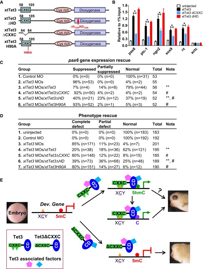 Figure 6. Both 5mC Hydroxylase Activity and the CXXC Domain Are Important for Tet3 Function. (A) Schematic representation of xtTet3 mutants.(B) The CXXC domain deletion disrupts Tet3 occupancy at specific gene promoters by ChIP-qPCR assay. Data are presented as mean ± SEM (n = 3). âp < 0.05.(C) Summarized results of five independent pax6 expression rescue experiments. âSuppressedâ means significantly suppressed pax6 expression in posterior and anterior neural plates; âPartially suppressedâ means pax6 expression is detected but not intact in posterior and anterior neural plates; âNormalâ means intact pax6 expression in posterior and anterior neural plates. ââp < 0.01 compared to xlTet3 MOs, # p < 0.01 compared to xlTet3 MOs/xtTet3.(D) Summarized results of five independent phenotypic rescue experiments. âPartial defectâ means mild abnormal head structure, small eyes or one eye; âComplete defectâ means abnormal head structure and no eye. ââp < 0.01 compared to xlTet3 MOs, # p < 0.01 compared to xlTet3 MOs/xtTet3.(E) A model of Tet3 action in gene transcription regulation. The Tet3 CXXC domain specifically binds to unmodified cytosine (underlined)-containing sequence motifs with a slight preference for G at âYâ position and a mild disfavor for T or 5mC at âXâ position, targeting Tet3 to the promoter of target developmental genes. Then, the 5mC hydroxylase activity of Tet3 converts adjacent 5mC to 5hmC, an intermediate for further DNA demethylation, thus activates the gene expression. CD: catalytic domain. Please refer to the related text for more details.See also Figure S7.