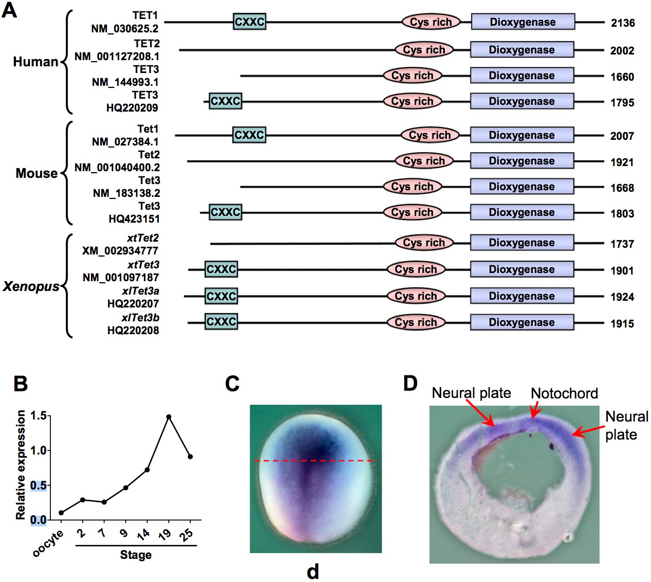 Figure S1. Tet3 Expression in Xenopus Embryos, Related to Figure 1. (A) Schematic diagram of Tet proteins. (B) Temporal expression of xlTet3 during Xenopus embryogenesis by RT-qPCR. xlTet3 expression was normalized to odc expression. (C and D) The expression of xlTet3 mRNA in the neural plate and notochord by in situ hybridization at stage 14. The site of the section shown in (D) is noted by a red dashed line in (C). d: dorsal view.