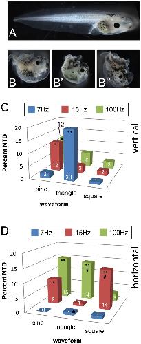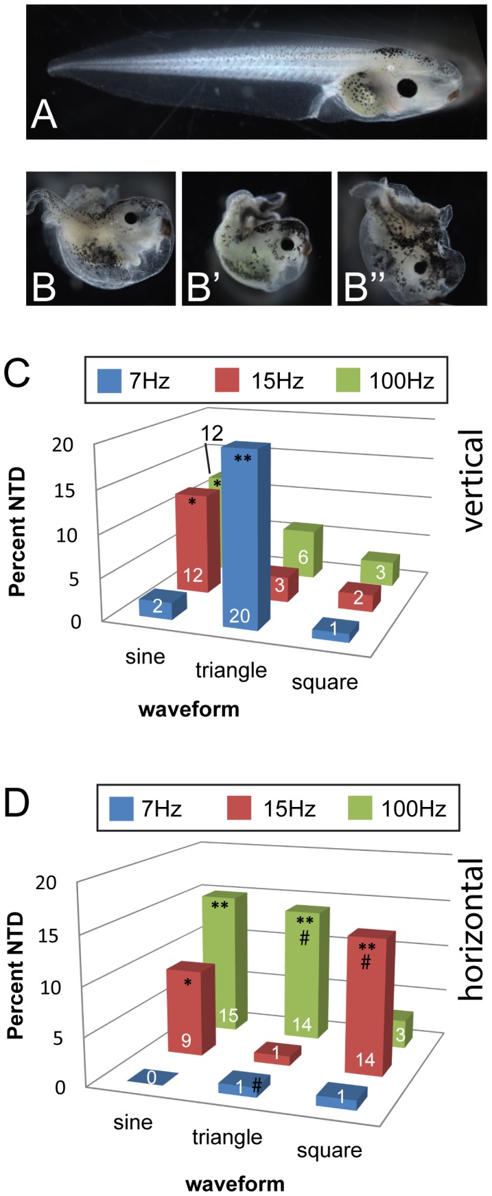 Figure 2. Vibration induces neural tube defects in a frequency-, waveform- and direction-specific manner in Xenopus embryos.Xenopus laevis embryos were vibrated from 1-cell through st. 19 (late neurulation) and then allowed to develop in a vibration-free environment approximately stage 45. A) The majority of embryos develop as tadpoles with properly fused spinal cords. B, B’, B”) Examples of tadpoles with neural tube defects (NTDs). NTDs were defined by shortened axes and un-fused spinal cords. Animals often developed split tails. (These animals were produced with 15 Hz sine vertical vibrations.) C) Applying vibrations vertically to embryos induced significant numbers of NTDs at all frequencies tested, but only for certain waveforms. D) NTDs were also observed following vibration in the horizontal direction, but only for specific combinations of frequencies/waveforms. Numbers on bars indicate frequencies of phenotypes for that treatment. NTDs were observed in <1% of controls. Each group includes at least 100 treated embryos. *p<0.01, **p<<0.001 relative to controls; on panel D, # indicates significant differences from vertical treatment (p<0.01).
