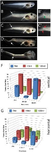 Figure 3. Vibrations induce abnormal tail morphology in Xenopus embryos.Xenopus laevis embryos were exposed to vibrations with a range of frequencies, waveforms and directions from 1-cell until approximately st. 19 (late neurulation). These embryos, as well as control embryos raised in a vibration-free environment, were scored at approximately stage 45 for abnormal tail morphologies. Compared to the normal tail appearance (A), a wide variety of bent tail phenotypes were seen, including: B) a single kink in the spine of the tail in the dorsal-ventral plane (kink marked by a green arrow in B’); C) two distinct kinks located within a small distance of each other (both kinks marked by red arrows in C’); D) a more gentle bending of the tail tissue in the dorsal-ventral plane; and E) a distinct kink in the tail in the left-right plane. (Animals shown in panels B-E were all produced with 15 Hz sine vertical vibrations.) For both vertical (F) and horizontal (G) vibrations, several frequencies and waveforms induced significant numbers of tail abnormalities. Numbers on bars indicate frequencies of phenotypes for that treatment. In un-vibrated controls, bent tails were observed in <8%. Each group includes at least 100 tadpoles. *p<0.01, **p<<0.001 relative to controls; on panel G, # indicates significant differences from vertical treatment (p<0.01).