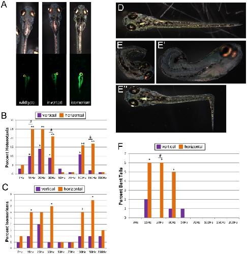 Figure 4. Vibration induces heterotaxia and disrupts tail morphogenesis in Zebrafish embryos.A) Organ situs was scored in zebrafish fry 7 days post fertilization using the auto-fluorescence of the pancreas and gall bladder (circled). In vibrated fish, inversions were often observed (with the gall bladder positioned to the left of the pancreas); isomerisms (with the gall bladder directly above the pancreas) were observed less often. These animals were generated by 20 or 30 Hz vertical sine vibrations. B) The incidence of heterotaxia observed in vibrated zebrafish for a total of 18 treatments. Heterotaxia was observed in 3–4% of un-vibrated controls. C) Isomerisms were induced by a few horizontal vibration treatments only. Isomerisms were never observed in untreated fish. D) Typical tail morphology in zebrafish fry at 7 days post fertilization. E-E”) Examples of abnormal tail morphologies observed in zebrafish that were vibrated from 1-cell overnight. These animals were generated by 20 or 30 Hz horizontal sine vibrations. F) Abnormal tail morphologies were rare, but significant numbers were observed following two horizontal vibration treatments. For all graphs, each group includes at least 110 fish. *p<0.01, **p<<0.001 relative to controls; # indicates significant differences between horizontal and vertical treatments (p<0.01).