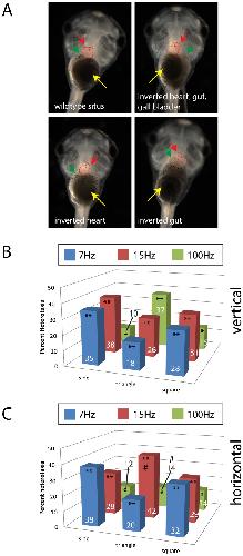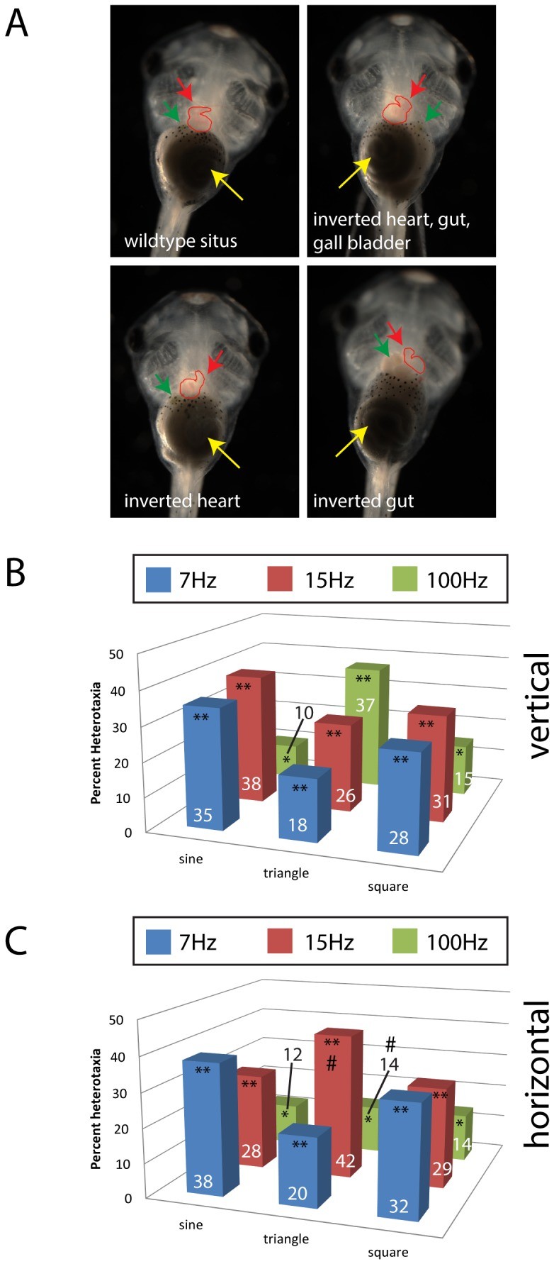 Figure 1. Vibration induces heterotaxia in Xenopus embryos, independent of waveform or direction.A) Shown are embryos with different organ situs (position), including three with various forms of heterotaxia, i.e. the inversion in placement of one or more organs. Red arrows indicate the apex of the heart; green arrows indicate the gall bladder; yellow arrows indicate the coiling of the gut. These animals were exposed to one of three vibrations that were previously shown to affect left-right patterning. Here, the waveforms were varied between sine, square and triangle waves. B) Vibrations applied vertically induce heterotaxia, regardless of which frequency and waveform combination was applied. C) Vibrations applied horizontally also induce heterotaxia. Heterotaxia rates in un-vibrated controls were approximately 1%. Numbers on bars indicate frequencies of phenotypes for that treatment. At least 110 embryos were included for each treatment. *p<0.01; **p<<0.001 relative to controls; on panel C, # indicates significant differences from vertical treatment (p<0.01).