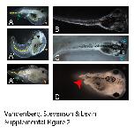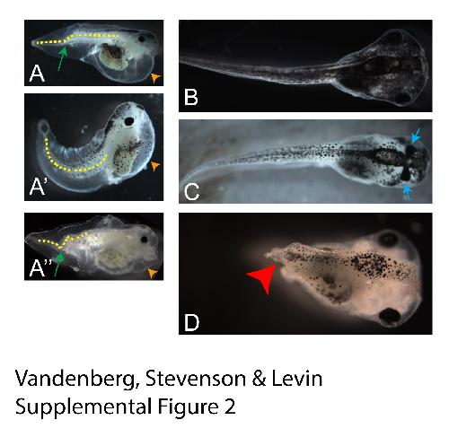 Vibration can induce a range of developmental patterning defects in Xenopus embryos. In addition to scored phenotypes, other severe developmental defects were occasionally observed in treated groups. However, these defects were observed infrequently enough that their incidence was not recorded. A Edema (indicated by orange arrowheads) was observed in a small number of embryos. This edema was often observed in tadpoles with tail defects including bent and curly tails (indicated by the dotted yellow lines, kinks indicated by green arrows). However, embryos with edemas were not scored for any phenotype due to their severe malformations. B) Hyperpigmentation was occasionally observed, but not related to any specific treatment. C) Craniofacial defects were observed including animals with narrow jaws and conjoined eyes, as shown here (blue arrows). Other craniofacial defects included missing facial structures and malformations in the eyes, mouth, nostrils and otoliths (not shown). D) Occasionally, we observed tadpoles with normal anterior structures but completely truncated tails (red arrowhead).