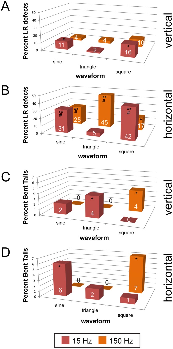 Figure 5. Vibration induces LR patterning and tail morphogenesis defects in zebrafish in a frequency-, waveform- and direction-specific manner.Zebrafish embryos were vibrated from 1-cell through the 5 somite stage, and then allowed to develop in a vibration-free environment until 7 days post-fertilization when they were scored for LR patterning defects (heterotaxia+isomerisms) and abnormal tail morphologies. A) Effects of vibrations applied vertically to LR patterning. Only two treatments induced LR defects. B) Vibrations applied horizontally also induce LR defects. When vibrations were applied in this direction, every treatment with the exception of 15 Hz triangle waves induced significant numbers of LR patterning defects. LR defects were observed in approximately 5% of untreated controls. C) Vertical vibrations induce abnormal tail morphologies in two treatments: 15 Hz triangle and 150 Hz square. D) Horizontal vibrations also induced malformed tails in two different treatments: 15 Hz sine and 150 Hz square waves. Numbers on bars indicate frequencies of phenotypes for that treatment. For all treatments, each group includes at least 110 fish. On graphs, *p<0.01, **p<<0.001 relative to controls; # indicates significant differences between horizontal and vertical treatments (p<0.01).