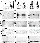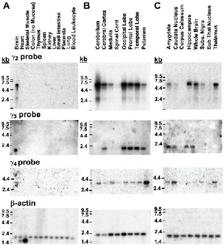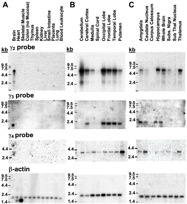 Figure 1. Northern blot analysis of the human γ2, γ3, and γ4 mRNA transcripts. A. Human multiple-tissue northern blots revealed that the γ2, γ3, and γ4 are exclusively detected in the brain. B & C. Brain region blots determined that the γ2 and γ4 are almost ubiquitously expressed, but at differential levels in the same tissues. γ3 is more specifically localized to cerebral cortex, amygdala, caudate nucleus and hippocampus. Size markers were from an RNA ladder provided on the blot by BD Biosciences Clontech and the β-actin control probe results are displayed in the bottom panels.