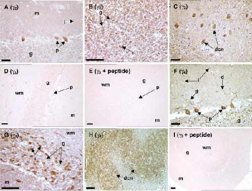 Figure 3. Expression of the γ2, γ3, and γ4 stargazin-like proteins in human cerebellum. A. γ2 immunoreactivity in the molecular layer (m) and part of the adjacent granule cell layer (g) in a cerebellar folium. Strong γ2 immunostaining was seen in the Purkinje cell somata (p) that continued into the dendrites, observed as moderate staining of the molecular layer neuropil. Cell bodies in the molecular layer with positive γ2 immunoreactivity are small interneurons (i). B. In the granule cell layer, the granule cells (g) are moderately stained for γ2 although the strongest immunostaining in this region is actually in the interneurons (i). C. The dentate cerebellar nucleus (dcn), displayed strong γ2 immunostaining in the cell bodies of this nucleus with only weak to moderate staining in the surrounding neuropil. In this particular section, cell nuclei are stained blue by Mayer's hematoxylin counterstain. D. Cerebellar folia displayed little to no γ3 immunostaining in the central white matter (wm) and molecular layer (m). Weak immunostaining was observed in the Purkinje cell bodies and the interneurons of the granule cell layer (g). E. Pre-absorption control, with the peptide immunogen for the γ3 Ab in the adjacent section to Fig. 3D. F. The cell bodies of the Purkinje cells (p) stained strongly for γ4 and this extended well into the Purkinje cell dendrites (d). The surrounding molecular layer neuropil (m) displayed light-moderate staining, as did the granule cell layer (g). Cell bodies in the molecular layer immunoreactive to the γ4 Ab were small interneurons (i). G. Granule cell layer interneurons (i) stained much more strongly for γ4 than the granule cells (g). H. The dcn gave a strong γ4 immunostaining signal in the perisomatic neuropil with only weak staining in the nucleus cell bodies. I. Immunizing peptide pre-absorption control for the γ2 Ab. Pre-absorption of the γ3 or γ4 Abs with their immunizing peptides produced almost identical results. Scale bars in all panels represent 25 μm.