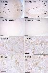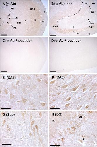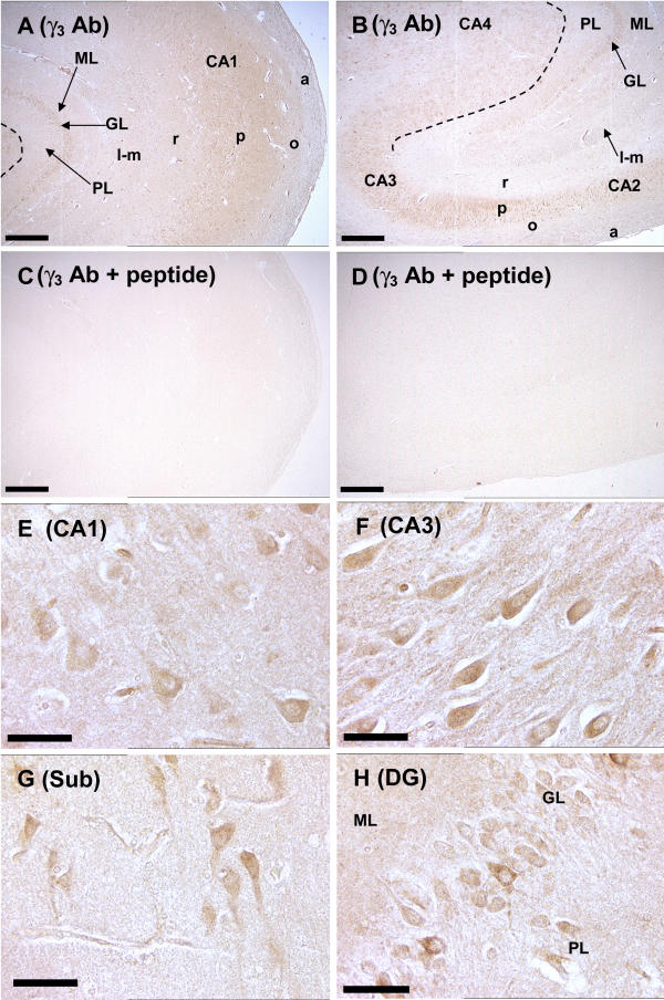 Figure 5. γ3 immunohistochemistry in human hippocampus. A. The pyramidal cell layer (p) of the CA1 region exhibited moderate to strong staining for γ3. Weak staining was observed in the stratum oriens (o) and stratum radiatum (r). The alveus (a) and lacunosum-moleculare (l–m) are in general, absent of immunoreactivity. B. More intense γ3 immunostaining was observed in the CA2 and CA3 pyramidal cell layers than in CA1. Strong staining was also detected in CA4 cell bodies but surrounding neuropil is devoid of immunoreactivity. C and D. Sections adjacent to those displayed in panels A and B incubated with immunizing peptide-pre-absorbed γ3 Ab. E. Moderate to strong staining of CA1 pyramidal cell bodies and weaker staining in the surrounding neuropil. F. Intense staining of the pyramidal cells of the CA3 with moderate perisomatic staining. G. Cell bodies in the subiculum (Sub) are moderately stained and neuropil staining is very weak. Neuropil staining in panels E, F and G may reflect relative cell densities in each region. H. Granule cells of the dentate gyrus were stained moderately to strongly by the γ3 Ab. The immunoreactivity is mainly in the soma of these cells, but can also be seen in the early branches of the granule cells dendritic trees, which extend into the lightly stained molecular layer. The neuropil of the polymorphic layer is almost devoid of staining. Scale bars in panel A–D represent 250 μm, in panels E–H 25 μm.