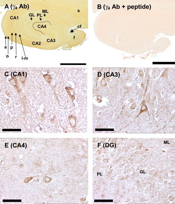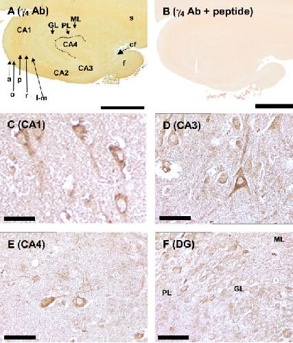 Figure 6. γ4 immunohistochemistry in human hippocampus. A. γ4 immunoreactivity was seen throughout the pyramidal cell layers each region of Ammon's horn and the surrounding neuropil with staining most intense in the CA2/3 transition region. Labeled regions are as in figures 4 and 5 with the addition of subiculum (s) choroidal fissure (cf) and fimbria (f). B. Section adjacent to that in panel A incubated with immunizing peptide pre-absorbed γ4 Ab. C. CA1 pyramidal cell bodies are moderately to strongly stained by γ4 Ab with moderate staining in surrounding neuropil. D. Strong staining of pyramidal cells in the CA3 with only slightly weaker immunostaining in the neuropil. E. Staining of CA4 cell bodies is moderate to strong with moderate neuropil staining. F. Although positively stained, the granule neurons of the dentate gyrus do not stain as strongly for γ4 as do pyramidal cells. Scale bars in panel A and B represent 5 mm and in panels C–F 25 μm.