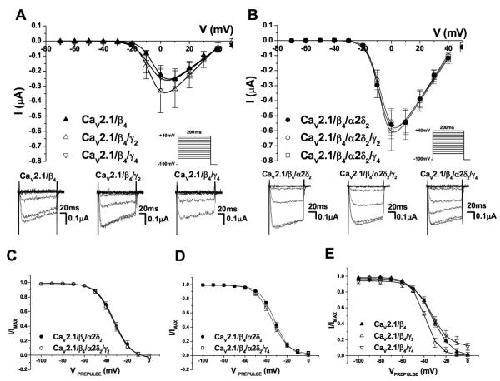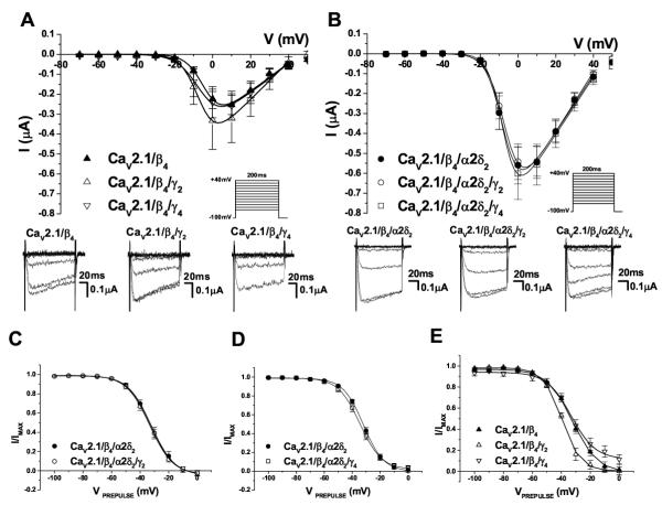 Figure 7. Influence of γ2 and γ4 upon CaV 2.1/β4 ± α2δ2 VDCC currents expressed in Xenopus oocytes.A The peak current-voltage relationships for CaV2.1/β4 (n = 16), CaV2.1/β4/γ2 (n = 14) and CaV2.1/β4/γ4 (n = 11) show no significant differences in any parameters (Table 1). The bottom panels display representative traces recorded from a single oocyte injected with each subunit combination investigated. B. The peak current-voltage relationships for CaV2.1/β4/α2δ2 (n = 43), CaV2.1/β4/α2δ2/γ2 (n = 34) and CaV2.1/β4/α2δ2/γ4 (n = 20) show no significant differences in any parameters (Table 1). In both panels A and B, only representative traces from -50 to +10 mV are displayed for reasons of clarity. C. Mean steady state inactivation data for IBa recorded in 10 mM Ba2+ from Xenopus oocytes injected with CaV2.1/β4/α2δ2 (n = 18) or CaV2.1/β4/α2δγ (n = 18) D. CaV2.1/β4/α2δ2 (n = 20), or CaV2.1/β4/α2δ2/γ4 (n = 20). Co-expression of either γ2 or γ4 produced data almost identical to the control. E. Oocytes injected with CaV2.1/β4 (n = 22), CaV2.1/β4γ2 (n = 16) and CaV2.1/β4γ4 (n = 9) normalized to the maximum current Imax and fitted with a single Boltzmann function. The numerical data for parameters defining the steady-state inactivation relationships are displayed in Table 2.
