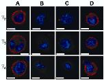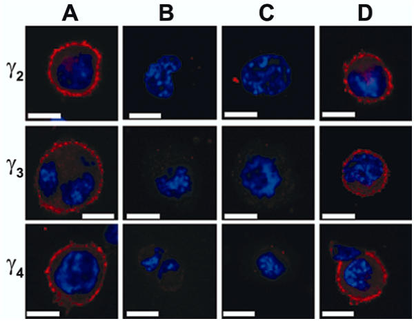 Figure 2. Transient expression of γ2, γ3, and γ4 in COS-7 cells. A. Positive staining for γ2, γ3, or γ4 (red) is strongly localized to the membranes of permeablized cells transfected with the individual γ2, γ3, or γ4 cDNAs. Little immunostaining is observed in the cytoplasm between the membrane and nucleus (blue). B. Non-transfected cells did not stain for γ2, γ3, or γ4 using the Abs generated in this study. C. Cells transfected with γ2, γ3, or γ4 cDNA, but not permeablized during the staining process do not show immunoreactivity for the appropriate anti-γ Abs. D. When co-transfected together with the CaV2.1 and β4 VDCC subunit cDNAs, the expression patterns of γ2, γ3, or γ4 were unaltered. Scale bars in all panels represent 10 μm.
