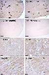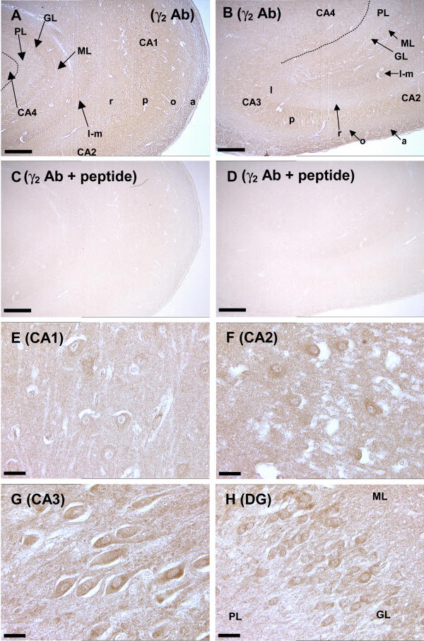 Figure 4. γ2 immunohistochemistry in human hippocampus. A. In the CA1, alveus (a), stratum oriens (o) most adjacent to the pyramidal layer, and the pyramidal layer (p) all stain moderately for γ2. The stratum radiatum (r) and lacunosum-moleculare (l-m) stain much more weakly. B. Strong detection of γ2 protein occurred in the alveus and pyramidal layers of CA2 and CA3 regions. Moderate immunostaining is detected in stratum lucidum (l). Staining of the strata oriens and radiatum was very weak in this region. The dentate gyrus molecular layer (ML) stains moderately for γ2 and the granule layer strongly (GL). γ2 staining is weak or absent in the polymorphic layer (PL). Cells in the CA4 show moderate staining. C and D. Serial sections to those displayed in panels A and B incubated with synthesis peptide pre-absorbed γ2 Ab. E. In the region of the CA1 towards the CA2 the perisomatic staining is light to moderate with similar staining of the cell bodies. F. In the CA2, staining of neuropil and cell bodies is more intense than in CA1. G. Staining of the soma of the CA3 hippocampal neurons is strong with moderate staining of the surrounding neuropil. H. The dentate gyrus shows moderate staining of the molecular layer and dense immunostaining in the granule layer. The polymorphic layer is weakly stained. Scale bar in panels A–D represents 250 μm, in panels E–H 25 μm. The dotted lines in panels A and B represent the border between the CA4 region of the hippocampus and the polymorphic layer of the dentate gyrus.