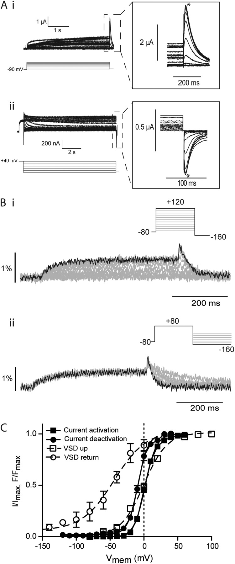 Figure 1. Mode shift of hERG channels. (A) Example traces recorded in response to protocols shown to measure the voltage-dependent equilibria of activation (i) and deactivation (ii) of E518C hERG channels. Insets are expansions of the highlighted regions. Peak currents were measured at the points marked with asterisks. (B) Example fluorescent traces recorded from MTSR-labeled 518C using voltage-clamp fluorometry in response to the protocols shown to measure activation/upward motion (i) and return (ii) of the VSD of E518C hERG. (C) Summary of voltage dependence of equilibria of activation and deactivation. Solid lines are fits of the Boltzmann equation to current data, whereas broken lines are fits of the Boltzmann equation to the fluorescent data. V0.5 values were −4 ± 0.9 mV and −44 ± 2 mV for current activation and deactivation, respectively (SEM; n = 10) and 1.4 ± 2 mV and −50.9 ± 1 mV for upward motion and return of the VSD, respectively (SEM; n = 12).
