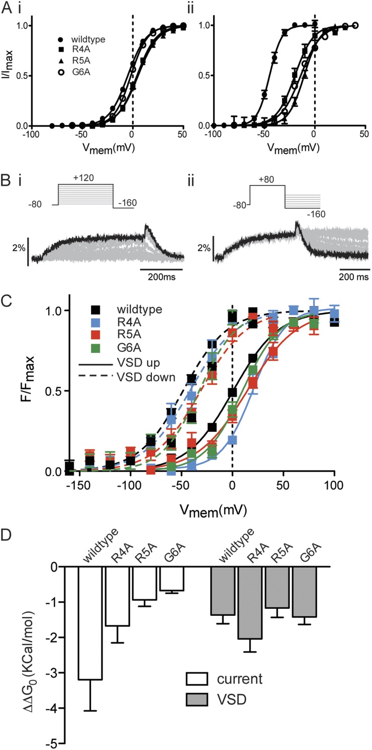 Figure 6. Voltage-clamp fluorometry of residues contributing to coupling. (A) Summary of the voltage-dependent equilibria of activation (i) and deactivation (ii) of ionic current for R4A, R5A, and G6A mutants in the E518C background. Solid lines are fits of the Boltzmann equation to data. (B) Example fluorescent traces recorded from MTSR-labeled R4A E518C hERG using voltage-clamp fluorometry in response to the protocols shown to measure upward motion (i) and return (ii) of the VSD. (C) Summary of the voltage-dependent equilibria of VSD upward motion and return. V0.5 values for VSD upward motion were −1.4 ± 2 mV, 20.9 ± 2.6 mV, 10 ± 3.5 mV, and 6.2 ± 3.8 mV for E518C, R4A, R5A, and G6A, respectively (SEM; n > 4). V0.5 values for VSD return were −46.4 ± 1 mV, −34.5 ± 7.2 mV, −29.6 ± 3.8 mV, and −29.0 ± 4.4 mV for E518C, R4A, R5A, and G6A, respectively (SEM; n > 4). (D) Difference between free energy terms (ΔΔG0) associated with the voltage-dependent equilibrium of current deactivation relative to current activation (open) and VSD return relative to VSD upward motion (gray; SEM; n ≥ 6).