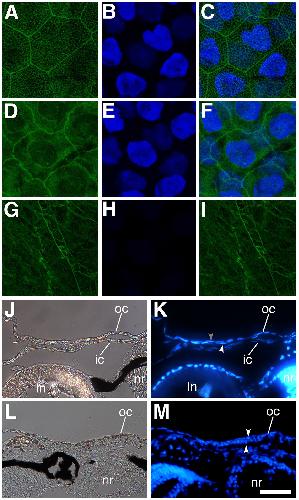 Fig. 1. Morphology of larval cornea tissues in whole mount and transverse sections of Xenopus laevis. (A) Confocal images of an intact excised cornea (pelt) of st502 larvae. (A) Outer epithelial layer labeled with Phalloidin (green), DAPI labeled nuclei (blue) and merged images, respectively. (D) Basal epithelial layer labeled with Phalloidin (green), DAPI (blue) and merged images, respectively. (G) Deeper fibrillar layer labeled with Phalloidin (green), DAPI (blue) and merged images, respectively. (J) DIC image of transverse section of control larval eye showing thin, dual-layered epithelium. (K) Corresponding Hoechst nuclear stained image to that seen in J showing flattened nuclei. (L) DIC image of transverse section of 5-day regenerating larval eye with thickened cells of the epithelium. (M) Corresponding Hoechst nuclear stained image to that seen in L. Gray arrowhead points to one nucleus of the outer cornea epithelial layer and white arrowhead identifies a nucleus in the basal epithelial layer. The gray arrowhead points to the nucleus of a cell of the outer epithelial layer and one located in the basal cornea epithelium is denoted with a white arrowhead. ic; inner cornea; ln, lens; nr, neural retina; oc, outer cornea. Scale bar in M equals 6 μm for A, and 100 μm in J.