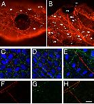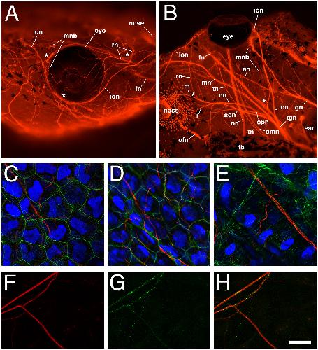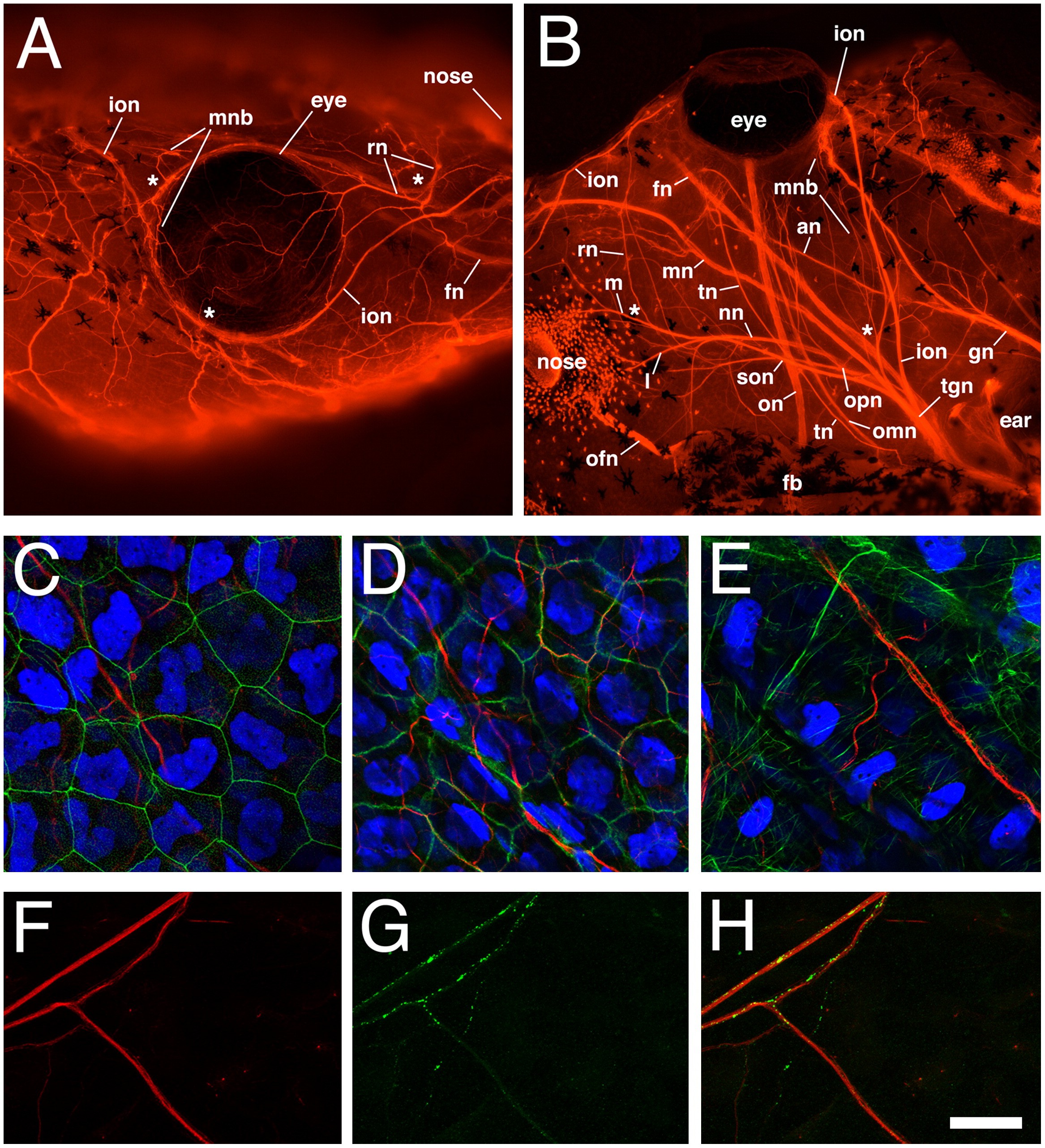 Fig. 2. (A) Larval (st48) Xenopus specimens showing distribution of acetylated tubulin labeled nerves in the head. (A) Rightlateral view of the head with anterior to the right, and dorsal to the top of the figure. (B) Superior, dorsal view of the right side of the head with anterior to the left. Asterisks mark branches of sensory nerves that serve the corneaepithelium in A or their origins in B. (C) Confocal images showing different depths of acetylated tubulin immunostaining (red), cell boundaries labeled with phalloidin (green) and DAPI nuclear stain (blue). (C) Acetylated tubulin stained nerves of the outer epithelial layer. (D) Basal epithelial distribution of acetylated tubulin labeled nerves. (E) Fibrillar layer containing labeled nerve trunks with branching structures. (F) Confocal image showing distribution of acetylated tubulin labeled nerves in the cornea (red). (G) Corresponding image showing distribution of Substance P (green). (H) Merged images from F and G showing overlapping acetylated tubulin and Substance P protein localization. an, abducens nerve (CN VI); fb, forebrain; fn, facial nerve (CN VII); gn, glossopharyngeal nerve (CN IX); ion, infraorbital nerve; mn, mandibular nerve; mnb, fine branches of the mandibular nerve; ncn, nasociliary nerve (with m and l, labeling its terminal medial and lateral branches, respectively, which pass to the sides of the olfactory organs (nose)); ofn, olfactory nerve (CN I); omn, oculomotor nerve (CN III); on, optic nerve (CN II); opn, ophthalmic nerve; rn, retrograde branch of nasociliary nerves; son, supraorbital nerve; tn, trochlear nerve (CN IV); tgn, trigeminal nerve (CN V). Scale bar in H equals 150 μm in A and 6 μm in C.