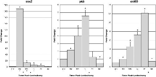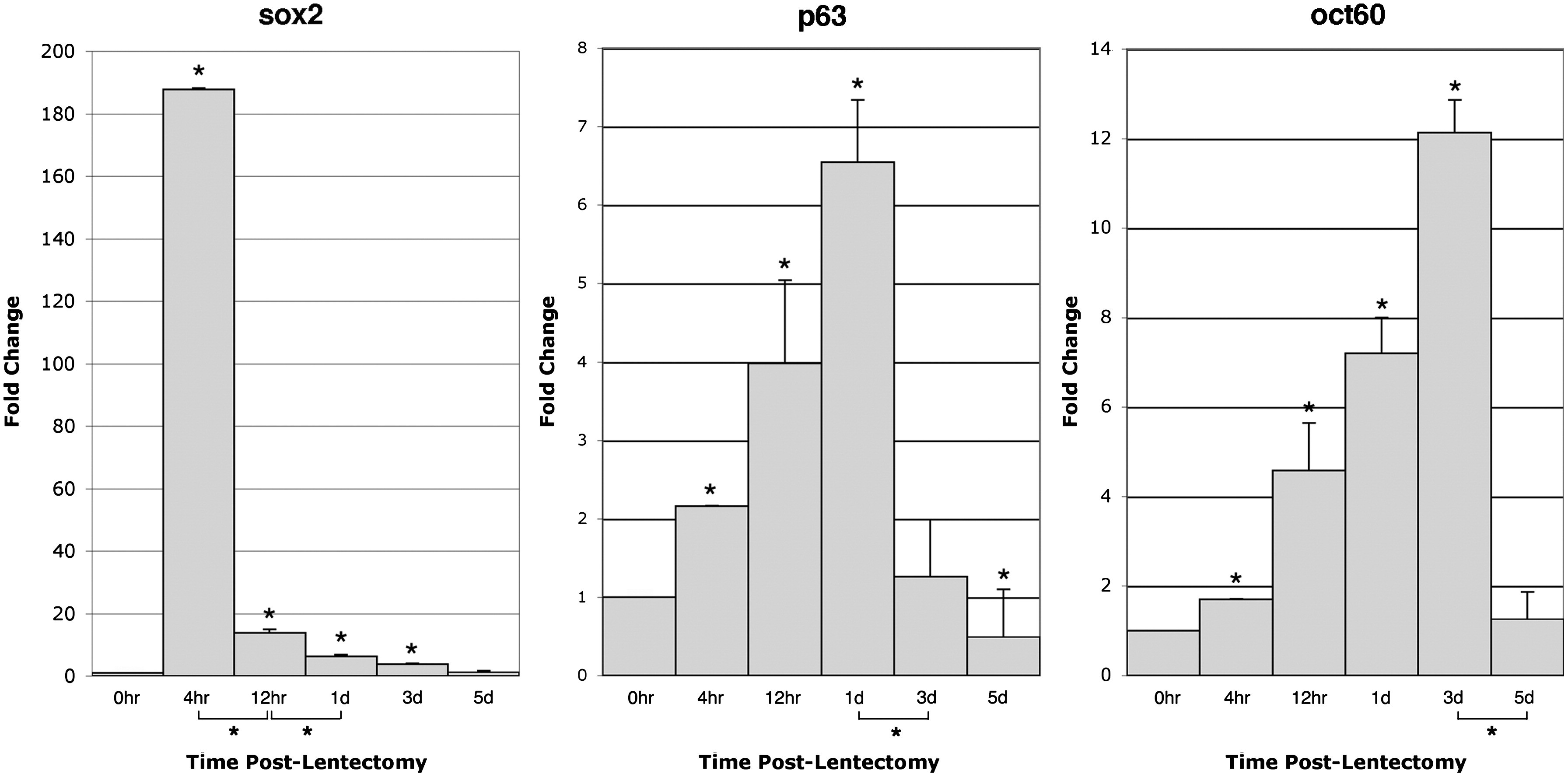 Fig. 3. Quantitative PCR (qPCR) results for sox2, p63 and oct60 expression during lens regeneration in stage 502 Xenopus laevis larval cornea epithelia. Relative expression levels were compared to control cornea epithelial expression and normalized against odc expression at the same larval stages (st502). Data for each time point was run in triplicate and represents independently pooled cornea samples collected from 0 h (control unoperated corneas), 4 h, 12-h, 1-day, 3-day and 5-days after lens removal. Error bars are indicated in black. Significant expression changes as compared to control unoperated corneas are denoted with an asterisk at the top of each bar graph. Significant expression changes between various key time points compared are noted underneath the X-axis. * denotes p values<0.05 using Students t-test.