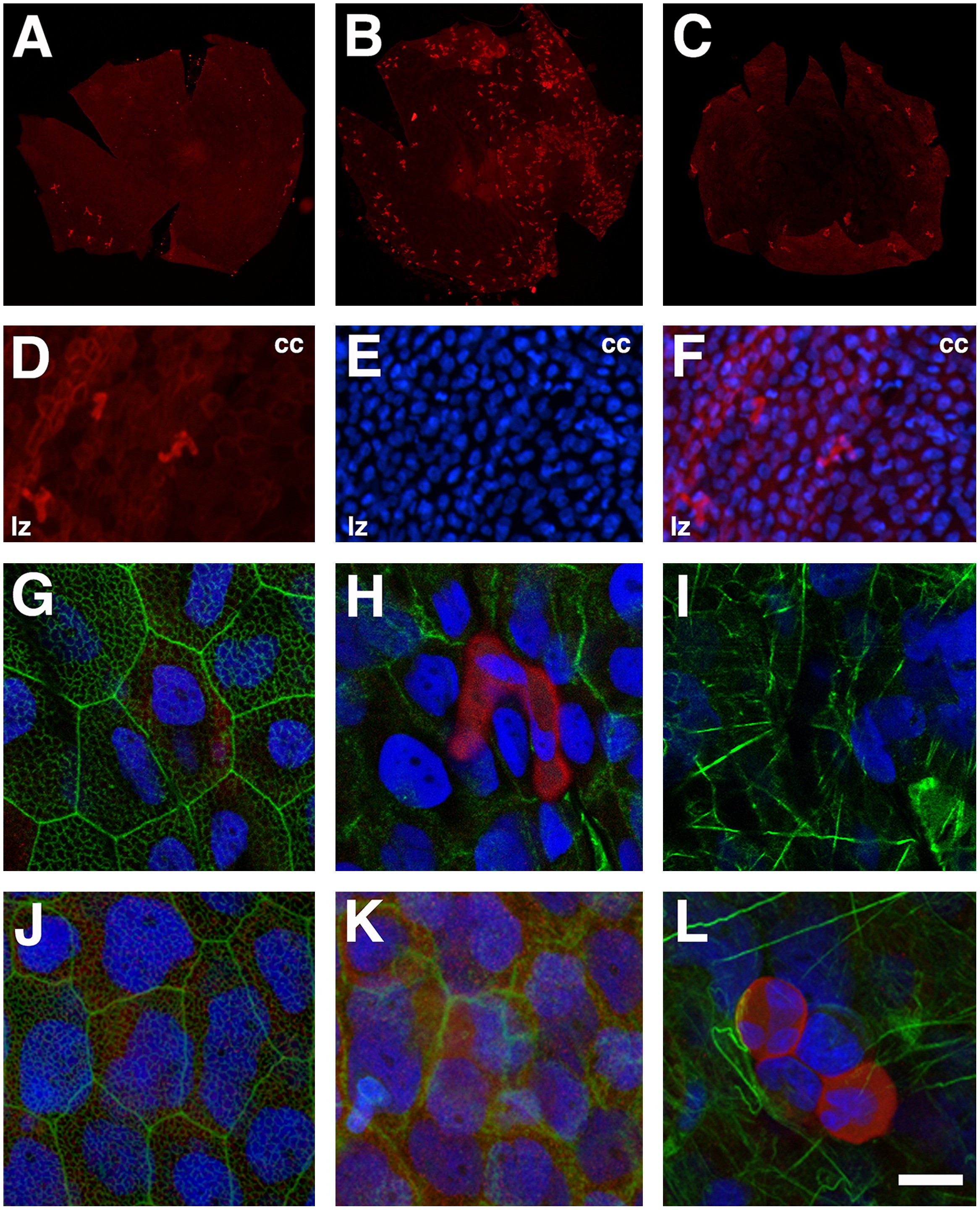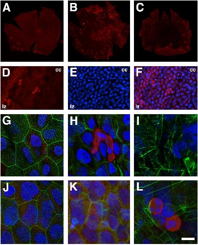Fig. 4. Antibody labeling of sox2 (red) in whole Xenopus larval cornea epithelium (st502). (A) Antibody labeling in whole corneas showing the distribution and appearance of labeled cells in regenerating corneas. (A) Control cornea with very few sox2 labeled cells located around the periphery in the limbal zone. (B) Regenerating cornea just 4 h after lens removal. Note the increased number of labeled cells that have appeared in the central cornea. (C) Regenerating cornea 5 days following lens removal with a decreased number of sox2 labeled cells, which are again restricted to the periphery. (D) Representative higher magnification views showing sox2 protein labeling in irregularly-shaped cells of the cornea. The outer periphery or limbal zone is located to the left of each photo and the center of the cornea is towards the right. (D) Distribution of sox2 antibody (red). Some low level sox2 expression is also detected throughout other cells of the cornea epithelium. (E) Corresponding view showing distribution of DAPI stained nuclei (blue). (F) Merged images from D and E. (G) Confocal images of a 3-day regenerating cornea, showing one irregular sox2 expressing cell located in the basal layer (red). Cell boundaries and fibrillar layer are counterstained with phalloidin (green) and DAPI nuclear stain (blue). (G) Outer cornea epithelium. (H) Basal cornea epithelium. The sox2 expressing cell appears to contain multiple nuclei or multi-lobed nucleus. (I) Fibrillar layer with no apparent sox2 labeling. (J) Confocal images of 1-day regenerating cornea epithelium with sox2 antibody labeling (red). (J) Outer cornea epithelium. (K) Basal cornea epithelium with diffuse sox2 label throughout the cells. (L) Deeper fibrillar layer with a multinucleated cell brightly labeled with sox2. This cell appears to either be dividing or squeezing through two adjacent unlabeled cells. cc, central cornea; lz, limbal zone. Scale bar in L indicates 220 μm for A, 40 μm for D, 6 μm for G, and 8 μm for J.