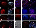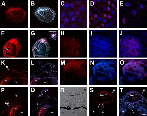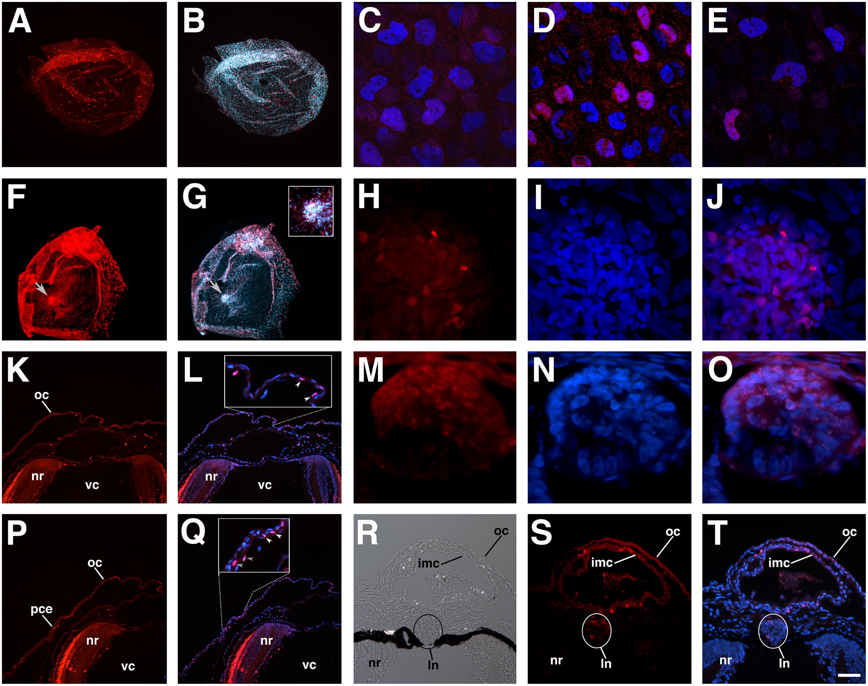 Fig. 7. EdU labeling (red) of nuclei in proliferating cells during different time point of lens regeneration in Xenopus eyes. (A) Cornea 1-day post EdU injection and lens removal (st502). (A) Fluorescence light micrograph of cornea pelt showing presence of EdU labeled nuclei (red). (B) Corresponding image to A showing additional location of all nuclei labeled with Hoecht (blue). (C) Higher magnification confocal image of 1-day regenerating cornea showing outer cornea epithelial layer with no appreciable EdU labeling. Nuclei are stained with Hoechst. (D) Deeper focal plane showing corresponding basal cornea epithelial layer with presence of EdU labeled nuclei. (E) Deeper fibrilar layer showing presence of some nuclei, one of which is EdU labeled. (F) Regenerating cornea 5-days post-EdU injection and lens removal (st52). (F) Fluorescent EdU labeled nuclei in 5-day regenerating cornea. Gray arrow shows location of intense EdU labeling. (G) Corresponding image to F showing additional location of all nuclei labeled with Hoecht (blue). The location of a regenerating lens placode is enlarged in the inset. This could represent the point of attachment of a larger lens vesicle that detached from the cornea upon excision from the animal. (H) Higher magnification confocal image of an organized regenerating lens placode 5-days after EdU addition and lens removal. (H) Image showing lens placode with EdU labeling in red. (I) Corresponding image of H showing nuclei labeled with Hoecsht. (J) Merged fluorescence images in H and I. (K) Section of eye showing EdU labeled cells present in a regenerated lens 14 days after EdU injection and lens removal. The cornea is at the upper edge of these images. (K) Section of eye showing the lens containing red EdU labeled nuclei. (N) Merged image from K combined with corresponding Hoechst labeled nuclei. (M) Cornea implantation experiment where larvae (st502) were labeled with EdU, chased for 7 days, following which the outer cornea was excised and implanted into the vitreous chamber of an unlabeled control larvae (st502). (M) DIC image of eye 7-days after cornea implant. Small regenerating lens is outlined in black. (N) Corresponding image to M showing EdU-labeled nuclei. Note EdU labeled nuclei within the regenerating lens, outlined in white. (O) Merged fluorescence images shown in M and N. imc, EdU labeled implanted donor cornea; ln, lens; nr, neural retina; oc, outer cornea; pce, peripheral cornea epithelium; vc, vitreous chamber. Scale bar in T equals 100 μm in A, F; 60 μm in G (inset); 6 μm in C; 10 μm in H; 15 μm in K, and 40 μm in M.