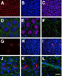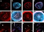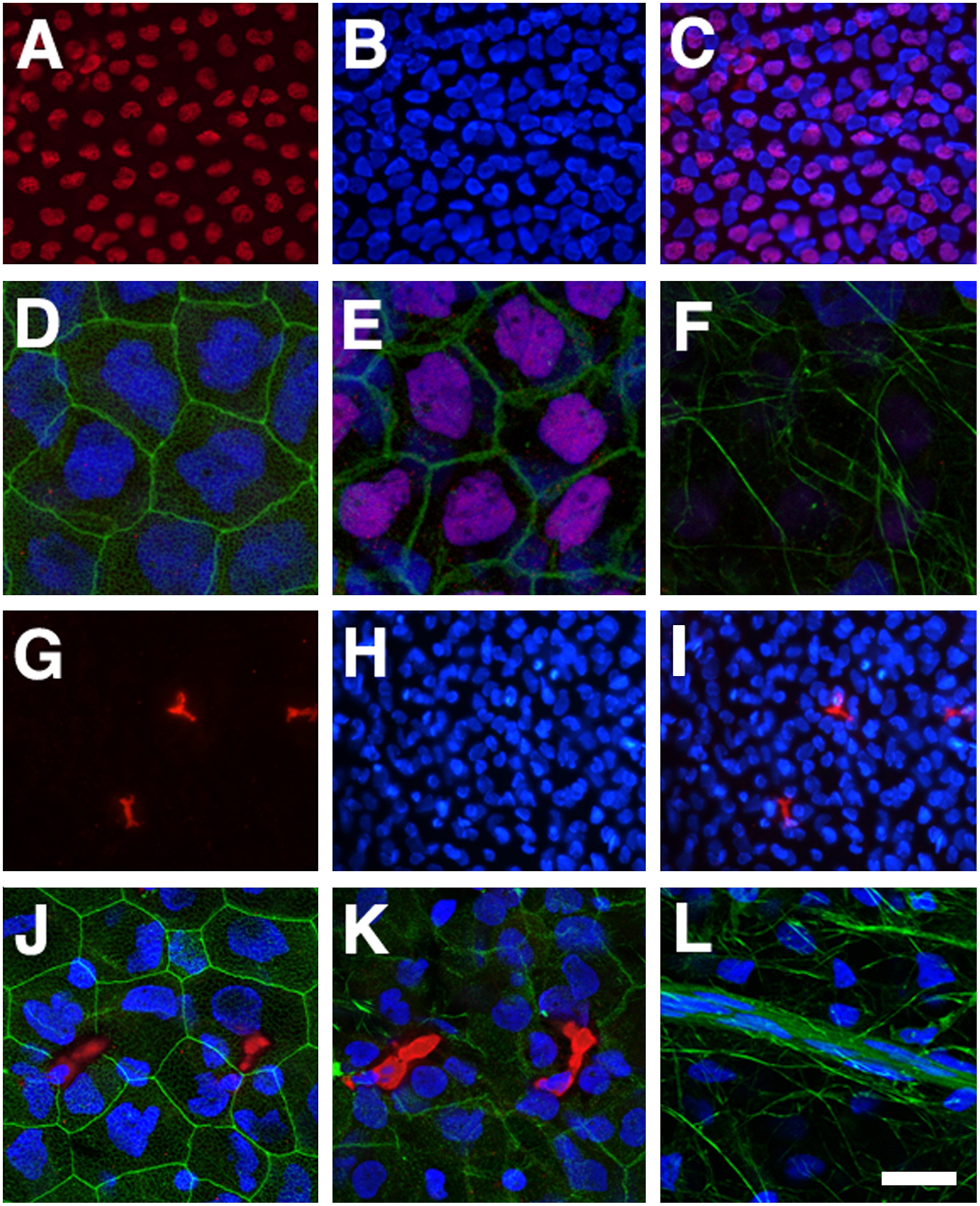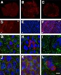 Fig. 5. Fluorescence light microscopic and confocal images showing antibody labeling of Xenopus whole cornea epithelium (st502). (A) p63 (ΔNp63 isoform) protein labeling of the cornea epithelium. (A) p63 labeling is represented in red. (B) Corresponding image to A with DAPI labeled nuclei (blue). (C) Merged images from A and B. (D) Confocal imaging of p63 antibody labeling. (D) Outer epithelium with no p63 labeling. Cell boundaries and fibrils are counterstained with phalloidin (green). (E) Localized p63 labeling (purple) in every nucleus of the basal epithelium. (F) Fibrillar layer with no p63 labeling. (G) c-myc protein labeling in the peripheral region of the cornea (limbal zone). (G) c-myc localization to multi-lobed cells (red). (H) Corresponding image to G with DAPI stained nuclei. (I) Merged image of G and H. (J) Confocal images of c-myc labeling in cells of the cornea epithelium (limbal zone). (J) Outer cornea epithelium with projections of c-myc labeled cells. (K). Basal cornea epithelium displaying irregular shaped c-myc expressing cells. (L) Deeper fibrillar layer displaying no c-myc labeled cells. Scale bar in L indicates 25 μm for A, 6 μm for D, 50 μm for G, and 10 μm for J.