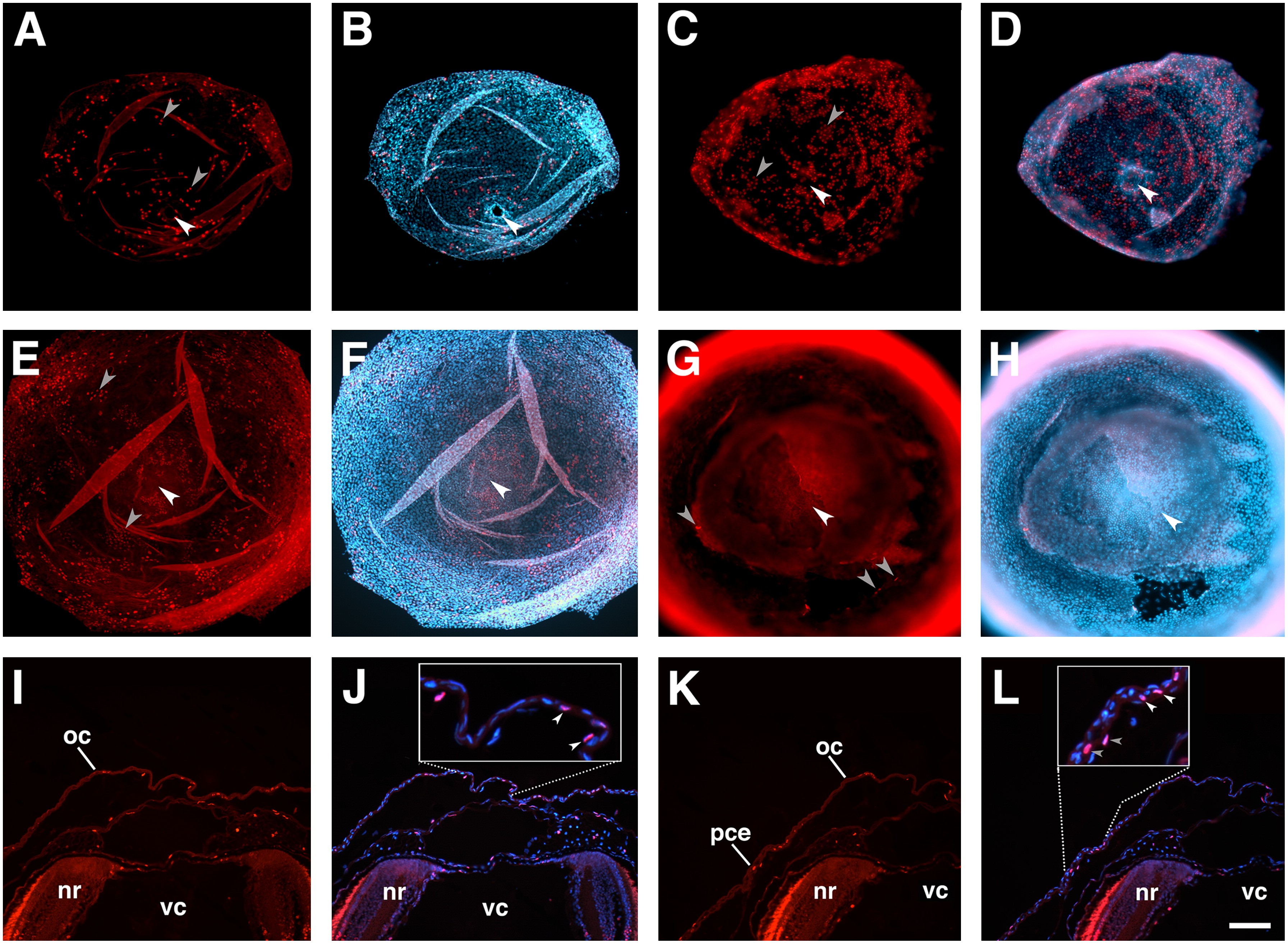Fig. 6. EdU labeling of proliferating cells in isolated intact control Xenopus larval cornea epithelia (pelts) following a single pulse of EdU labeling. Animals were fixed at various time points following injection and EdU detected with fluorescent azide 594. White arrowheads point to the location of the central attachment point of the cornea epithelium to the cornea endothelium. (A) Cornea 1-day post-EdU injection (st502). (A) Fluorescent EdU labeled nuclei (red). Representative pairs of EdU labeled nuclei are denoted with gray arrowheads, of which many can be seen in this specimen. (B) EdU labeled image from A merged with Hoechst 33342 labeled nuclei (blue). (C) Cornea 5-days post-EdU injection (st52). (C) Fluorescent EdU labeled nuclei. Representative clusters of EdU labeled nuclei are noted with gray arrowheads. (D) Merged images from C and corresponding Hoechst labeled nuclei (blue). (E) Cornea 14-days post-EdU injection (st545). (E) Fluorescent EdU labeled nuclei. Representative clusters of EdU labeled nuclei are pointed out with gray arrowheads. (F) Merged images from E and corresponding Hoechst 33342 labeled nuclei. (G) Cornea 28-days post-EdU injection (st567). (G) A few fluorescent EdU labeled nuclei are present in this cornea (denoted by gray arrowheads). (H) Merged images from G and corresponding Hoechst 33342 labeled nuclei. (I) Sections of eyes from animals injected with EdU 14 days prior to fixation. (I) Section of 14-day control case showing the central cornea overlying the optic cup where EdU label occurs mostly in nuclei of the basal epithelium. (J) Corresponding image to I showing additional location of all nuclei labeled with Hoecht. (K) Section of 14-day EdU labeled case (same case shown in K) showing the periphery of the cornea. (K) EdU labeled cells from 14-day control case are shown in red and merged with Hoechst labeled nuclei in L. Scale bar in L indicates 100 μm.