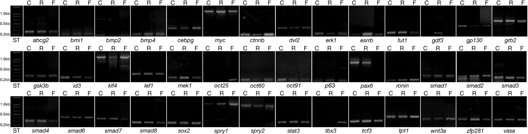 Supplementary Fig. S1. Expression of pluripotency genes in control corneas (C), during days 1 of lens regeneration (R), and in flank (F) epithelium as assayed by RT-PCR. All PCR products were verified by sequence analysis. 1 kb standards (st) are to the far left, as indicated.