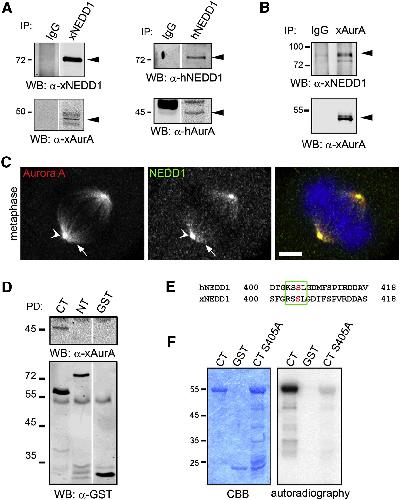 (F) In vitro kinase assay with Xenopus proteins: His-xAurora A phosphorylates specifically the C- terminal domain of xNEDD1 (CT). Control GST and the N-terminal domain of xNEDD1 (NT) are not phosphorylated. The CBB stained gel and the corresponding autoradiography are shown. The asterisk indicates a degradation product of GST-xNEDD1 NT.