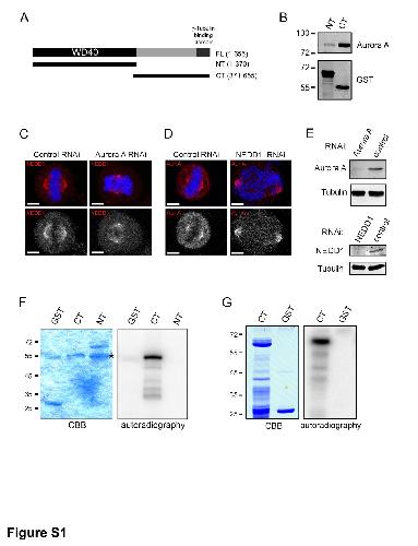 (G) In vitro kinase assay with human proteins: His-hAurora A phosphorylates specifically the C- terminal fragment of hNEDD1 (CT) and not GST. The CBB stained gel and the corresponding autoradiography are shown.
