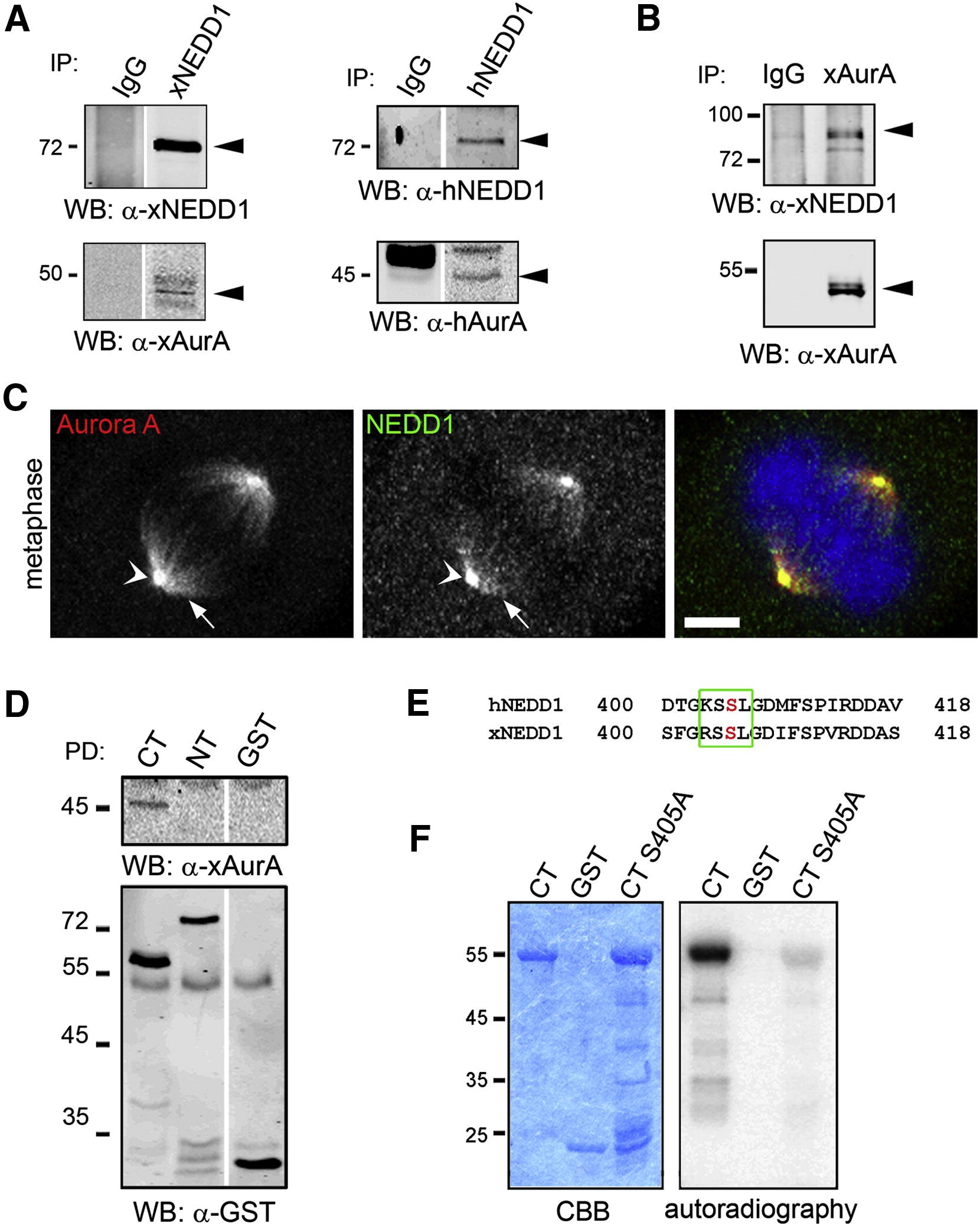 Figure 1. Aurora A Interacts With and Phosphorylates NEDD1 in Mitosis(A) Western blot analysis of NEDD1 immunoprecipitations from CSF-arrested Xenopus laevis egg extracts (left) and mitotic HeLa cells lysates (right). Anti-xNEDD1 antibodies specifically immunoprecipitated xNEDD1 and xAurora A from egg extract. Mouse anti-hNEDD1 antibodies immunoprecipitated hNEDD1 and hAurora A from mitotic HeLa cells (the unspecific rabbit IgGs used as control are strongly recognized by the anti-rabbit secondary antibodies).(B) Western blot analysis of xAurora A immunoprecipitation from CSF-arrested egg extracts. The anti-xAurora A antibodies specifically immunoprecipitate Aurora A and NEDD1.(C) Confocal images of a HeLa cell in metaphase showing the localizations of Aurora A and NEDD1 by immunofluorescence. Aurora A and NEDD1 colocalize at the centrosome (arrowhead) and at the spindle MTs (arrow). A maximum projection is shown. In the merge image, Aurora A is in red, NEDD1 is in green, and DNA is in blue. Scale bar represents 5 μm.(D) Western blot analysis of a pull-down experiment using GST-fusion proteins of the C-terminal (CT) and N-terminal (NT) domains of xNEDD1. GST-NEDD1-CT (CT), GST-NEDD1-NT (NT), or GST alone were immobilized on anti-GST antibody-coated beads and incubated in CSF-arrested egg extract. The beads were retrieved, washed, and resuspended in loading buffer. The recombinant proteins are visualized with anti-GST antibodies in the lower panel. Aurora A was specifically recovered only with GST-xNEDD1-CT, as shown on the western blot with anti-Aurora A antibodies in the upper panel.(E) Alignment of the human and frog NEDD1 sequences containing the conserved Ser405 found to be phosphorylated in vitro by Aurora A. The conserved motif for Aurora A phosphorylation [R/K]-X-[S/T]-[I/L/V] is framed in green, with Ser405 highlighted in red.(F) Coomassie brilliant blue (CBB)-stained gel and autoradiography of an in vitro kinase assay with His-xAurora A and GST, GST-xNEDD1-CT, and GST-xNEDD1-CTS405A. xAurora A phosphorylates GST-xNEDD1-CT specifically, but not xNEDD1 CT S405A. This shows that Aurora A phosphorylates NEDD1 at Ser405.See also Figures S1 and S2.