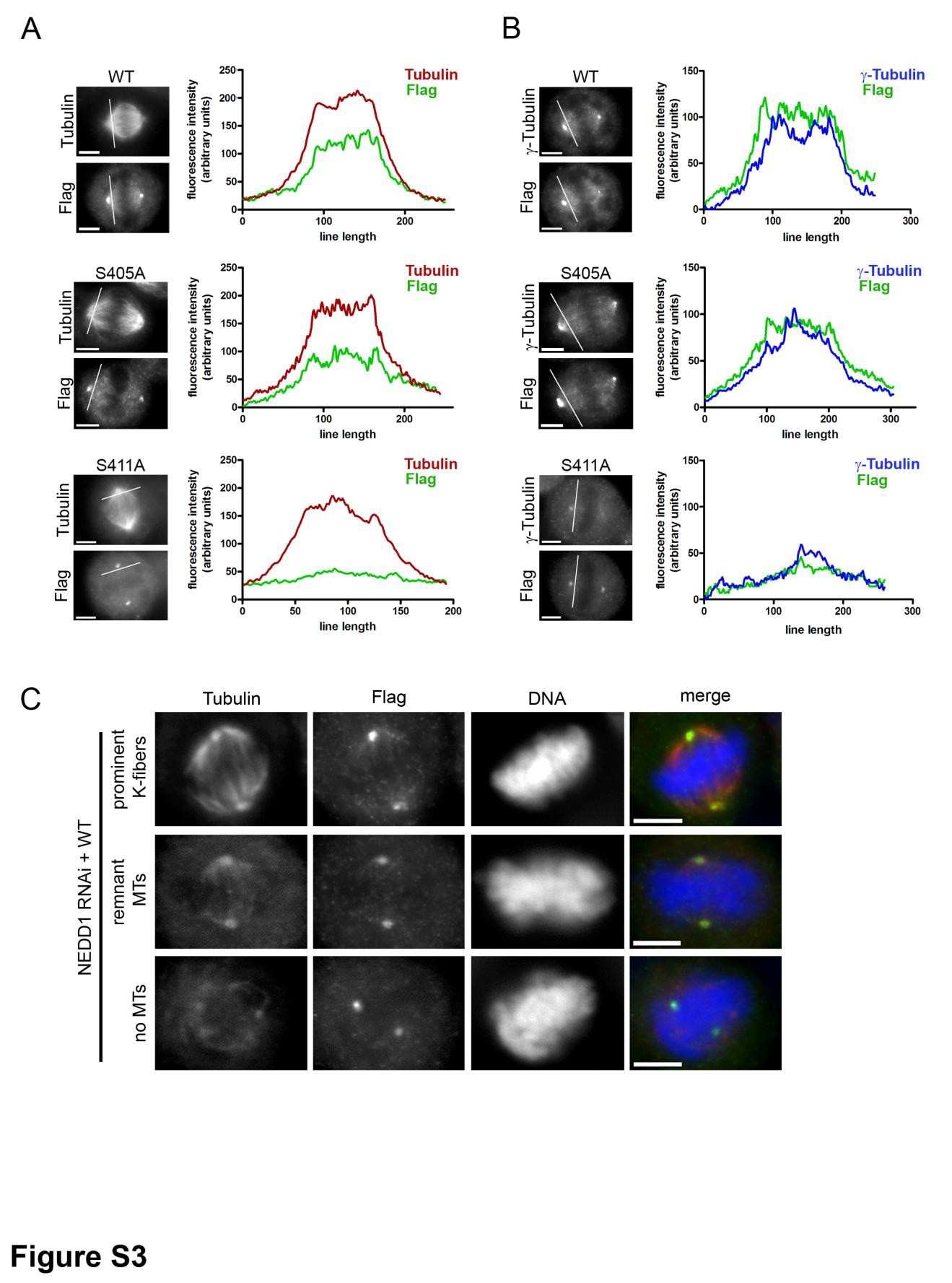 (A) Quantification of the tubulin and Flag fluorescence signal along the width of spindles assembled in NEDD1 silenced Hela cells expressing Flag-hNEDD1 WT (WT), Flag-hNEDD1 S405A (S405A) or Flag-hNEDD1 S411A (S411A) corresponding to the experiment shown in Figure 2A. The fluorescence signal intensity of tubulin (red lines) and the different Flag-tagged NEDD1 variants (green lines) were quantified along the lines across the half spindles (as indicated) using the lot Profilefunction of ImageJ software. The fluorescence intensities were plotted as a function of the line length. Flag-NEDD1 wt and Flag-NEDD1 405A localize to the spindle MTs whereas Flag-NEDD1 411A does not, as previously described [8]. Scale bars, 5 μm.