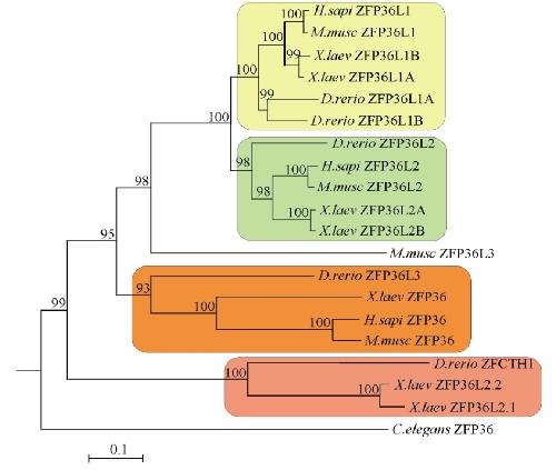 Figure 1 Bayesian tree depicting the phylogenetic relationships of the ZFP36 proteins. Branch confidence values are shown as