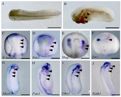 (H), Dbx1 (I) and Xath1 (G) is largely inhibited in the injected sides (arrowheads). (CâF), stage 15; (GâJ), stage 25. Bars=0.5 mm.