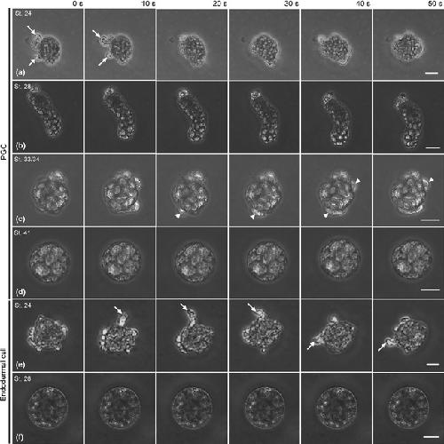 Figure 3. Time-lapse observation of isolated primordial germ cells (PGCs) and somatic cells. (a�f) A PGC isolated from stage 24 (a), 28 (b), 33/34 (c) or 41 (d), or an endodermal cell from stage 24 (e) or 28 (f) was cultured in the fibronectin-coated culture chamber. Arrows indicate small blebs. Arrowheads indicate the large clear blebs. Photos were taken at 10 s intervals after PGCs adhered to the substrate. Scale bars: 20 μm.