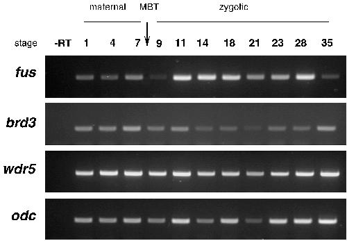Temporal expression profiles of fus, brd3 and wdr5 during early development. RT-PCR analysis of RNA extracted from embryos at the indicated stages. PCR on RNA without reverse transcription was performed to check the absence of genomic DNA (lane—RT). odc was used as a loading control. In Xenopus laevis the mid-blastula transition (MBT) occurs 6 h after fertilization, at stage 8 and marks the transition between maternal and zygotic gene expression.