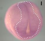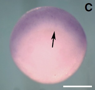 wdr5 (WD repeat domain 5) gene expression in Xenopus laevis embryo, assayed via in situ hybridization, NF stage 11, vegetal view, dorsal up.