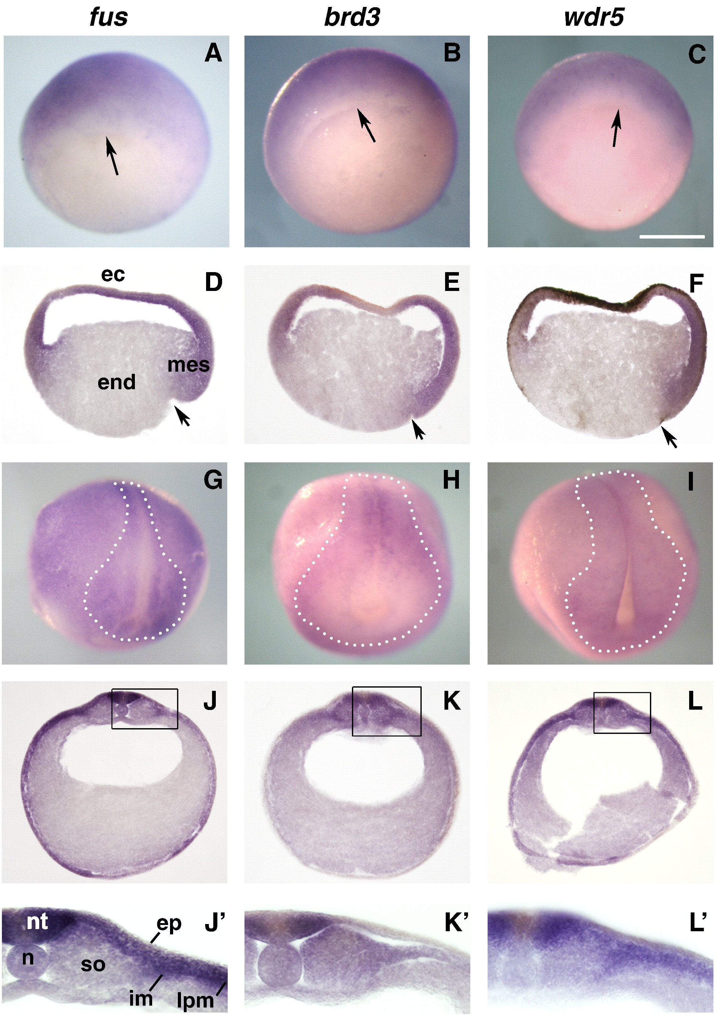 Spatial expression patterns of fus, brd3 and wdr5 mRNA during Xenopus laevis' early development. In situ hybridization is performed on embryos and sections at gastrula and neurula stages. Photomicrographs of whole mounts and sections for fus (left panels), brd3 (middle panels) and wdr5 (right panels) are shown. (AâC) At early gastrula (dorsal view, arrows indicate the position of the blastoporal lip) fus, brd3 and wdr5 transcripts are detected in the ectoderm and the mesoderm. (DâF) This pattern is confirmed by section analysis (sagittal section dorsal is on the right, arrows point to the dorsal blastoporal groove) which shows labeled ectoderm (ec) with no difference between the dorsal and the ventral sides and in the dorsal mesoderm (mes). The endoderm (end) is not labeled. (GâH) Whole-mounts at early neurula stage (anterior view, dorsal side up), expression is restricted to neural territories as indicated by the dotted areas. (JâL) Transversal section analysis (section is a trunk level, dorsal is up) shows that fus, brd3 and wdr5 are expressed in the neural tube (nt). Enlargement of respective sections (JââLâ), the epidermal ectoderm (ep) is labeled for fus (Jâ) but not for brd3 and wdr5 (Kâ, Lâ). A strong expression is present in the intermediate mesoderm (im) and in the lateral plate mesoderm (lpm) for fus and wdr5 (Jâ, Lâ) while brd3 is clearly expressed in the somitic mesoderm (so). Abbreviations: ec; ectoderm, end; endoderm, ep; epidermal ectoderm, im; intermediate mesoderm, lpm; lateral plate mesoderm, mes; mesoderm, n; notochord, nt; neural tube, so; somitic mesoderm. Scale bars 0.5 mm in (AâL).