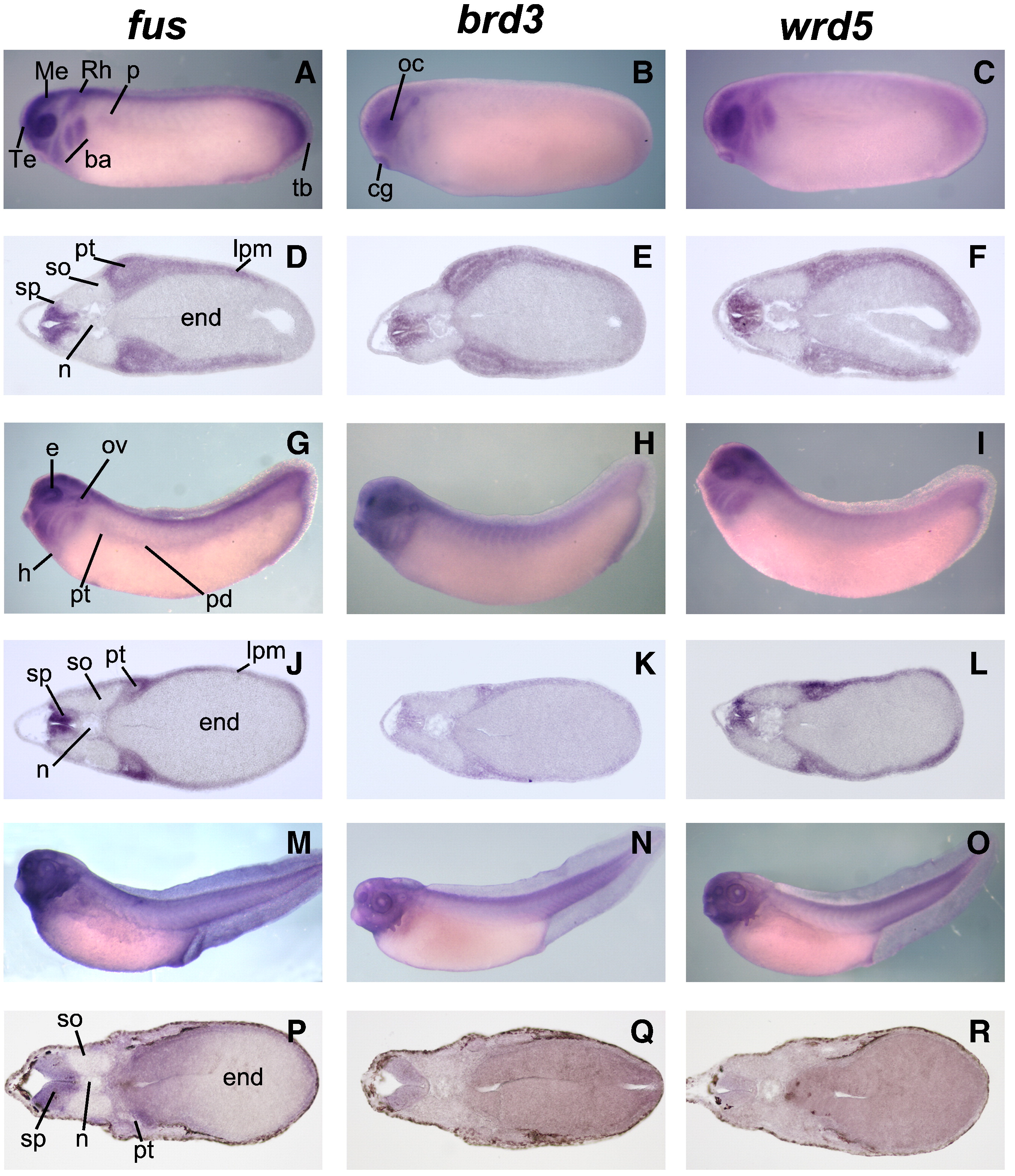 Spatial expression patterns of fus, brd3 and wdr5 at taibud and tadpole stages in Xenopus laevis. In situ hybridization is performed on embryos and sections at early (AâF), late tailbud (GâL) and tadpole (MâR) stages. Photomicrographs of whole mounts and sections for fus (left panels), brd3 (middle panels) and wdr5 (right panels) are shown. (AâC) At early tailbud fus, brd3 and wdr5 transcripts are expressed in anterior neural structures; telencephalon (Te), mesencephalon (Me) and rhombencephalon (Rh) and in the optic cup (oc). A strong expression is detected in the branchial arches (ba) for fus and wdr5 (A, C). The cement gland (cg) expressed brd3 and wdr5 (B, C). The tail bud (tb) and the pronephros (p) express fus at this stage (A). (DâE) Transversal sections at the level of the pronephros show the expression of all three transcripts in the spinal cord (sp), the pronephric tubule (pt) and the lateral plate mesoderm (lpm), and the endodermal yolk mass (end), notochord (n) and somites (so) are not labeled. (GâI) Late tailbud stage shows similar labeling patterns to the early tailbud. In addition, the pronephric tubule (pt) and duct (pd) are clearly labeled for fus; and the heart territory (h) for fus and wdr5 (G, I). (JâL) Transversal sections at the level of the pronephros confirm these patterns of expression and reveal that the level of brd3 transcripts decreases at this stage. (MâO) Whole-mounts and (PâR) transversal sections at pronephros level tadpole stage. Section analysis at this stage reveals that fus transcripts remain expressed in spinal cord (sp) and pronephric tubules (pt) brd3 and wdr5 are undetectable in these structures. Abbreviations: ba; branchial arches, cg; cement gland, e; eye, end; endodermal yolk mass, h; heart territory, lpm; lateral plate mesoderm, Me; mesencephalon, n; notochord, oc; optic cup, ov; otic vesicle, p; pronephros, pd; pronephric duct, pt; pronephric tubule, Rh; rhombencephalon, so; somite, sp; spinal cord, tb; tail bud, Te; telencephalon.