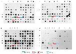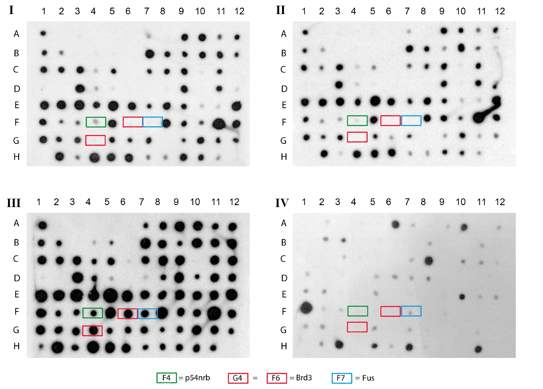 Autoradiographs of 4 replicates membranes carrying bacterially-amplified fragments corresponding to Ca2 +-enriched cDNA and hybridized with 32P-labeled probes from initial caffeine-induced cDNA population (I), control (non-induced) cDNA population (II), subtracted “sense” (caffeine minus control) cDNA population (III) and subtracted “reverse” (control minus caffeine) cDNA population (IV). The F7 spot (blue tag) corresponds to fus gene and illustrates the enrichment of gene expression as it is labeled by the enriched induced minus non induced probe and is undetectable with the initially induced population (compare I and III replicates, at F7) and absent on II and IV replicates. brd3 was found twice on this spotted membrane, at F6 and G4 spots (red tag) and exhibits the same response than fus. p54nrb gene on F4 deposit (green tag) is revealed with both initial and subtracted “sense” probes and is not labeled with non-induced “reverse” populations. The wdr5 expression in caffeine-treated animal cap explants corresponded to the G1 load in the original report [10]. GFP was spotted on H12 as a negative control.