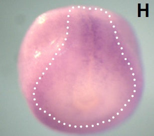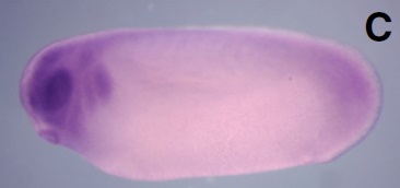 brd3 (bromodomain containing 3) gene expression in Xenopus laevis embryo, assayed via in situ hybridization, NF stage 18, anterior view, dorsal up.