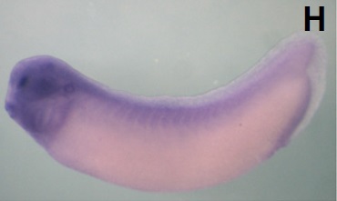 fus (FUS RNA binding protein) gene expression in Xenopus laevis embryo, assayed via in situ hybridization, NF stage 24, lateral view, anterior left, dorsal up.