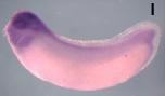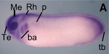 brd3 (bromodomain containing 3) gene expression in Xenopus laevis embryo, assayed via in situ hybridization, NF stage 24, lateral view, anterior left, dorsal up.