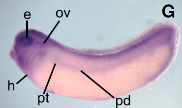 wdr5 (WD repeat domain 5) gene expression in Xenopus laevis embryo, assayed via in situ hybridization, NF stage 28, lateral view, anterior left, dorsal up.
