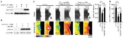 Figure 4. Morpholino mediated knockdown of cyba results in lowered amputation-induced ROS production and decreased regenerative tissue formation. (a) Western-blot against the FLAG epitope in cyba-flag mRNA injected cyba morphant or control embryos. (b) Western-blot against the myc epitope in myc-cyba mRNA injected cyba morphant or control embryos. (c) Representative transillumination and HyPerYFP imaging at amputation (T0) and 24 hpa in control, cyba morphants, and myc-cyba rescue cyba morphants, showing inhibition of ROS production and regenerative tissue formation by the cyba MO and rescue by co-injection of the MO-resistant myc-cyba mRNA. Black closed arrow shows regenerative bud. The quantification of HyPerYFP ratio increases following amputation in control, cyba morphants, and myc-cyba rescue construct injected cyba morphants is shown to the right of the panels. (d) Quantification of regenerative bud formation in control, cyba morphants, and myc-cyba rescue construct injected cyba morphants. Error bars indicate standard deviation (s.d.) of (n) specimens. Significance was determined using one-way ANOVA versus control. **, P < 0.01; ***, P < 0.001.
