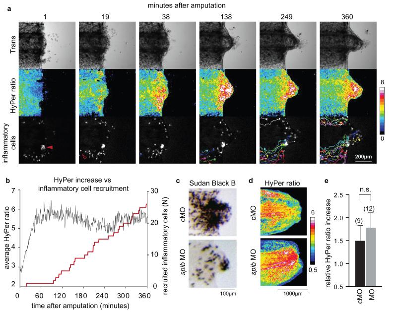 Figure 2. Amputation-induced ROS production does not depend on inflammatory cells. (a) Frames from the Supplementary Video showing transillumination (Trans), H2O2 production (HyPerYFP), and inflammatory cells (labeled with RFP) recruitment during the first 6 hrs following amputation. Closed red arrow points to blood clot that quickly forms in the distal site of the dorsal aorta following tail amputation 2. Open red arrow points to first inflammatory cell recruited into the area under examination. The colored lines show the migratory paths of the recruited inflammatory cells. (b) Quantification showing the change in average HyPerYFP ratio in relation to the number or recruited inflammatory cells into the area examined in the Supplementary Movie. (c) Sudan Black B staining of inflammatory cells in regenerative bud tissue at 24hpa, showing the decreased number of inflammatory cells in spib versus control morphant tadpoles. (d) Representative HyPerYFP imaging of control and spib morphants at 24 hours after tail amputation. (e) Quantification of H2O2 production using the HyPerYFP probe in control and spib morphants. Error bars indicate standard deviation (s.d.) of the mean. n tadpole tails analyzed indicated by brackets. n.s.; P > 0.05.