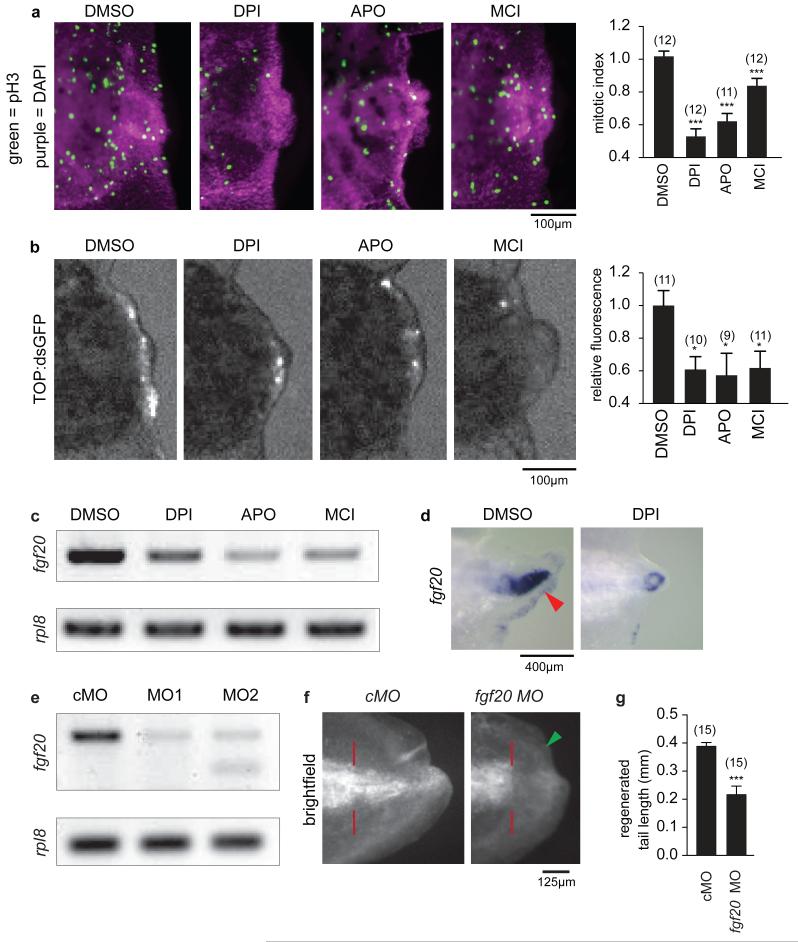 Figure 5. Amputation induced ROS are important for proper growth factor signaling during tail regeneration. (a) Representative images and quantification of X. laevis tadpoletail mitotic cells at 36hpa when cultured in control (DMSO) or ROS inhibitors DPI (2μM), APO (200μM), and MCI (200μM). (b) Representative images and relative Wnt/β-catenin signaling reporter dsGFP fluorescence at 36hpa in control (DMSO) or ROS inhibitors DPI (2μM), APO (50μM), and MCI (200μM) treated X. tropicalis tadpoles. (c) RT-PCR reactions amplifying fgf20 or reference gene rpl8 in control (DMSO) or ROS inhibitors DPI (2μM), APO (50μM), and MCI (200μM) at 36hpa in X. tropicalis tadpoles. (d)